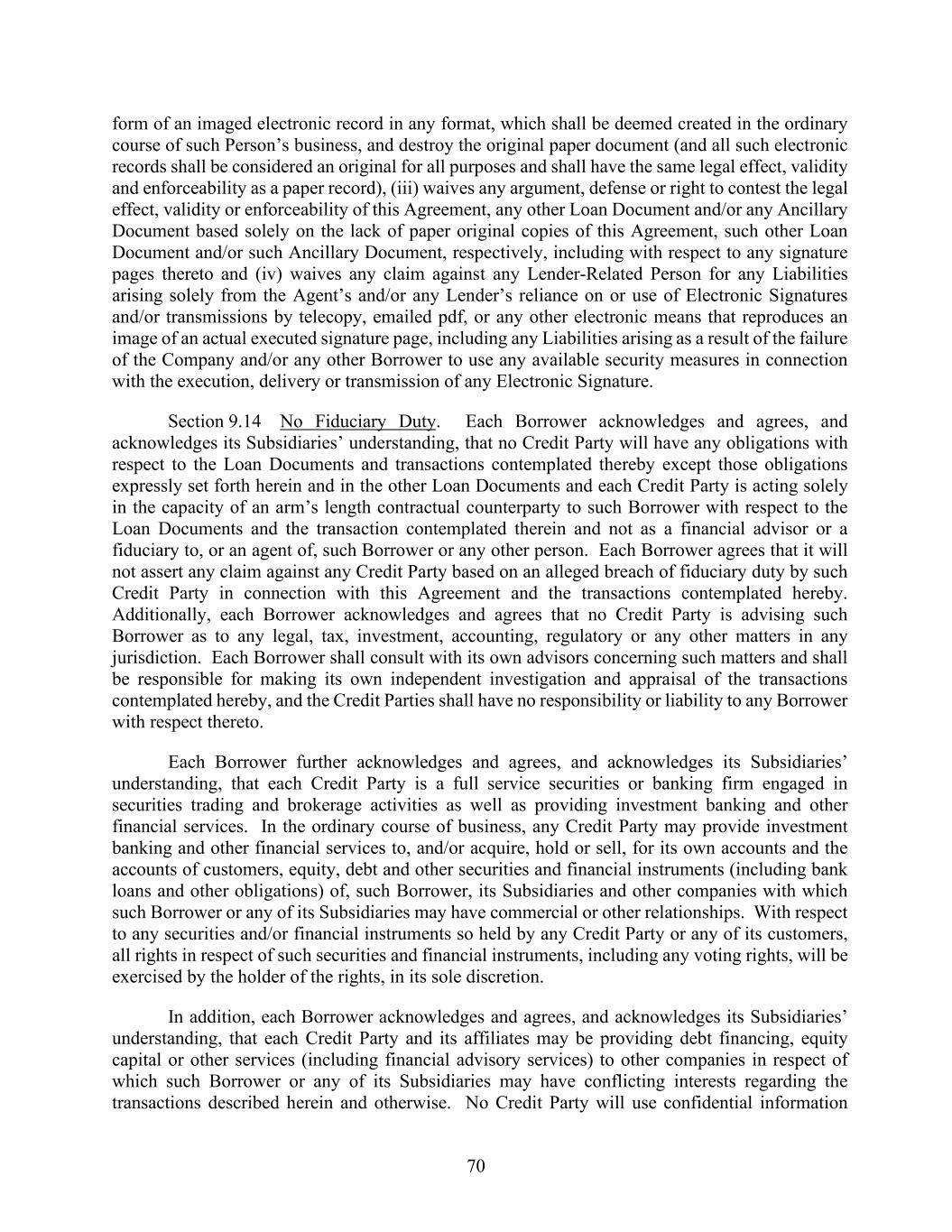 70 form of an imaged electronic record in any format, which shall be deemed created in the ordinary course of such Person’s business, and destroy the original paper document (and all such electronic records shall be considered an original for all purposes and shall have the same legal effect, validity and enforceability as a paper record), (iii) waives any argument, defense or right to contest the legal effect, validity or enforceability of this Agreement, any other Loan Document and/or any Ancillary Document based solely on the lack of paper original copies of this Agreement, such other Loan Document and/or such Ancillary Document, respectively, including with respect to any signature pages thereto and (iv) waives any claim against any Lender-Related Person for any Liabilities arising solely from the Agent’s and/or any Lender’s reliance on or use of Electronic Signatures and/or transmissions by telecopy, emailed pdf, or any other electronic means that reproduces an image of an actual executed signature page, including any Liabilities arising as a result of the failure of the Company and/or any other Borrower to use any available security measures in connection with the execution, delivery or transmission of any Electronic Signature. Section 9.14 No Fiduciary Duty. Each Borrower acknowledges and agrees, and acknowledges its Subsidiaries’ understanding, that no Credit Party will have any obligations with respect to the Loan Documents and transactions contemplated thereby except those obligations expressly set forth herein and in the other Loan Documents and each Credit Party is acting solely in the capacity of an arm’s length contractual counterparty to such Borrower with respect to the Loan Documents and the transaction contemplated therein and not as a financial advisor or a fiduciary to, or an agent of, such Borrower or any other person. Each Borrower agrees that it will not assert any claim against any Credit Party based on an alleged breach of fiduciary duty by such Credit Party in connection with this Agreement and the transactions contemplated hereby. Additionally, each Borrower acknowledges and agrees that no Credit Party is advising such Borrower as to any legal, tax, investment, accounting, regulatory or any other matters in any jurisdiction. Each Borrower shall consult with its own advisors concerning such matters and shall be responsible for making its own independent investigation and appraisal of the transactions contemplated hereby, and the Credit Parties shall have no responsibility or liability to any Borrower with respect thereto. Each Borrower further acknowledges and agrees, and acknowledges its Subsidiaries’ understanding, that each Credit Party is a full service securities or banking firm engaged in securities trading and brokerage activities as well as providing investment banking and other financial services. In the ordinary course of business, any Credit Party may provide investment banking and other financial services to, and/or acquire, hold or sell, for its own accounts and the accounts of customers, equity, debt and other securities and financial instruments (including bank loans and other obligations) of, such Borrower, its Subsidiaries and other companies with which such Borrower or any of its Subsidiaries may have commercial or other relationships. With respect to any securities and/or financial instruments so held by any Credit Party or any of its customers, all rights in respect of such securities and financial instruments, including any voting rights, will be exercised by the holder of the rights, in its sole discretion. In addition, each Borrower acknowledges and agrees, and acknowledges its Subsidiaries’ understanding, that each Credit Party and its affiliates may be providing debt financing, equity capital or other services (including financial advisory services) to other companies in respect of which such Borrower or any of its Subsidiaries may have conflicting interests regarding the transactions described herein and otherwise. No Credit Party will use confidential information