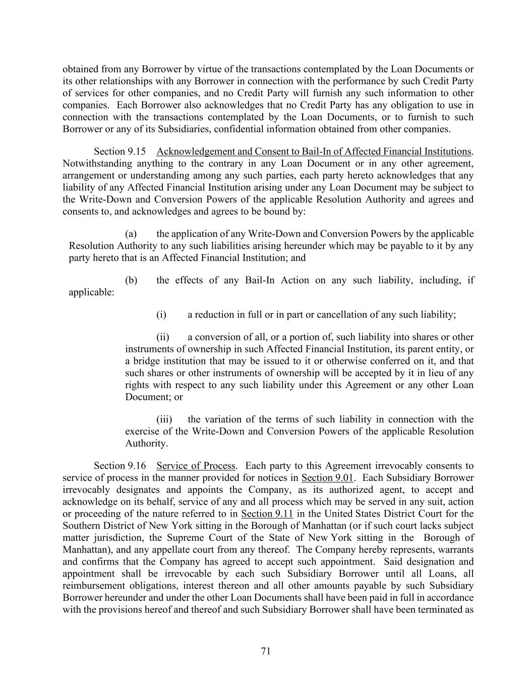 71 obtained from any Borrower by virtue of the transactions contemplated by the Loan Documents or its other relationships with any Borrower in connection with the performance by such Credit Party of services for other companies, and no Credit Party will furnish any such information to other companies. Each Borrower also acknowledges that no Credit Party has any obligation to use in connection with the transactions contemplated by the Loan Documents, or to furnish to such Borrower or any of its Subsidiaries, confidential information obtained from other companies. Section 9.15 Acknowledgement and Consent to Bail-In of Affected Financial Institutions. Notwithstanding anything to the contrary in any Loan Document or in any other agreement, arrangement or understanding among any such parties, each party hereto acknowledges that any liability of any Affected Financial Institution arising under any Loan Document may be subject to the Write-Down and Conversion Powers of the applicable Resolution Authority and agrees and consents to, and acknowledges and agrees to be bound by: (a) the application of any Write-Down and Conversion Powers by the applicable Resolution Authority to any such liabilities arising hereunder which may be payable to it by any party hereto that is an Affected Financial Institution; and (b) the effects of any Bail-In Action on any such liability, including, if applicable: (i) a reduction in full or in part or cancellation of any such liability; (ii) a conversion of all, or a portion of, such liability into shares or other instruments of ownership in such Affected Financial Institution, its parent entity, or a bridge institution that may be issued to it or otherwise conferred on it, and that such shares or other instruments of ownership will be accepted by it in lieu of any rights with respect to any such liability under this Agreement or any other Loan Document; or (iii) the variation of the terms of such liability in connection with the exercise of the Write-Down and Conversion Powers of the applicable Resolution Authority. Section 9.16 Service of Process. Each party to this Agreement irrevocably consents to service of process in the manner provided for notices in Section 9.01. Each Subsidiary Borrower irrevocably designates and appoints the Company, as its authorized agent, to accept and acknowledge on its behalf, service of any and all process which may be served in any suit, action or proceeding of the nature referred to in Section 9.11 in the United States District Court for the Southern District of New York sitting in the Borough of Manhattan (or if such court lacks subject matter jurisdiction, the Supreme Court of the State of New York sitting in the Borough of Manhattan), and any appellate court from any thereof. The Company hereby represents, warrants and confirms that the Company has agreed to accept such appointment. Said designation and appointment shall be irrevocable by each such Subsidiary Borrower until all Loans, all reimbursement obligations, interest thereon and all other amounts payable by such Subsidiary Borrower hereunder and under the other Loan Documents shall have been paid in full in accordance with the provisions hereof and thereof and such Subsidiary Borrower shall have been terminated as