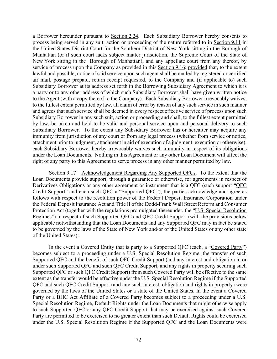 72 a Borrower hereunder pursuant to Section 2.24. Each Subsidiary Borrower hereby consents to process being served in any suit, action or proceeding of the nature referred to in Section 9.11 in the United States District Court for the Southern District of New York sitting in the Borough of Manhattan (or if such court lacks subject matter jurisdiction, the Supreme Court of the State of New York sitting in the Borough of Manhattan), and any appellate court from any thereof, by service of process upon the Company as provided in this Section 9.16; provided that, to the extent lawful and possible, notice of said service upon such agent shall be mailed by registered or certified air mail, postage prepaid, return receipt requested, to the Company and (if applicable to) such Subsidiary Borrower at its address set forth in the Borrowing Subsidiary Agreement to which it is a party or to any other address of which such Subsidiary Borrower shall have given written notice to the Agent (with a copy thereof to the Company). Each Subsidiary Borrower irrevocably waives, to the fullest extent permitted by law, all claim of error by reason of any such service in such manner and agrees that such service shall be deemed in every respect effective service of process upon such Subsidiary Borrower in any such suit, action or proceeding and shall, to the fullest extent permitted by law, be taken and held to be valid and personal service upon and personal delivery to such Subsidiary Borrower. To the extent any Subsidiary Borrower has or hereafter may acquire any immunity from jurisdiction of any court or from any legal process (whether from service or notice, attachment prior to judgment, attachment in aid of execution of a judgment, execution or otherwise), each Subsidiary Borrower hereby irrevocably waives such immunity in respect of its obligations under the Loan Documents. Nothing in this Agreement or any other Loan Document will affect the right of any party to this Agreement to serve process in any other manner permitted by law. Section 9.17 Acknowledgement Regarding Any Supported QFCs. To the extent that the Loan Documents provide support, through a guarantee or otherwise, for agreements in respect of Derivatives Obligations or any other agreement or instrument that is a QFC (such support “QFC Credit Support” and each such QFC a “Supported QFC”), the parties acknowledge and agree as follows with respect to the resolution power of the Federal Deposit Insurance Corporation under the Federal Deposit Insurance Act and Title II of the Dodd-Frank Wall Street Reform and Consumer Protection Act (together with the regulations promulgated thereunder, the “U.S. Special Resolution Regimes”) in respect of such Supported QFC and QFC Credit Support (with the provisions below applicable notwithstanding that the Loan Documents and any Supported QFC may in fact be stated to be governed by the laws of the State of New York and/or of the United States or any other state of the United States): In the event a Covered Entity that is party to a Supported QFC (each, a “Covered Party”) becomes subject to a proceeding under a U.S. Special Resolution Regime, the transfer of such Supported QFC and the benefit of such QFC Credit Support (and any interest and obligation in or under such Supported QFC and such QFC Credit Support, and any rights in property securing such Supported QFC or such QFC Credit Support) from such Covered Party will be effective to the same extent as the transfer would be effective under the U.S. Special Resolution Regime if the Supported QFC and such QFC Credit Support (and any such interest, obligation and rights in property) were governed by the laws of the United States or a state of the United States. In the event a Covered Party or a BHC Act Affiliate of a Covered Party becomes subject to a proceeding under a U.S. Special Resolution Regime, Default Rights under the Loan Documents that might otherwise apply to such Supported QFC or any QFC Credit Support that may be exercised against such Covered Party are permitted to be exercised to no greater extent than such Default Rights could be exercised under the U.S. Special Resolution Regime if the Supported QFC and the Loan Documents were