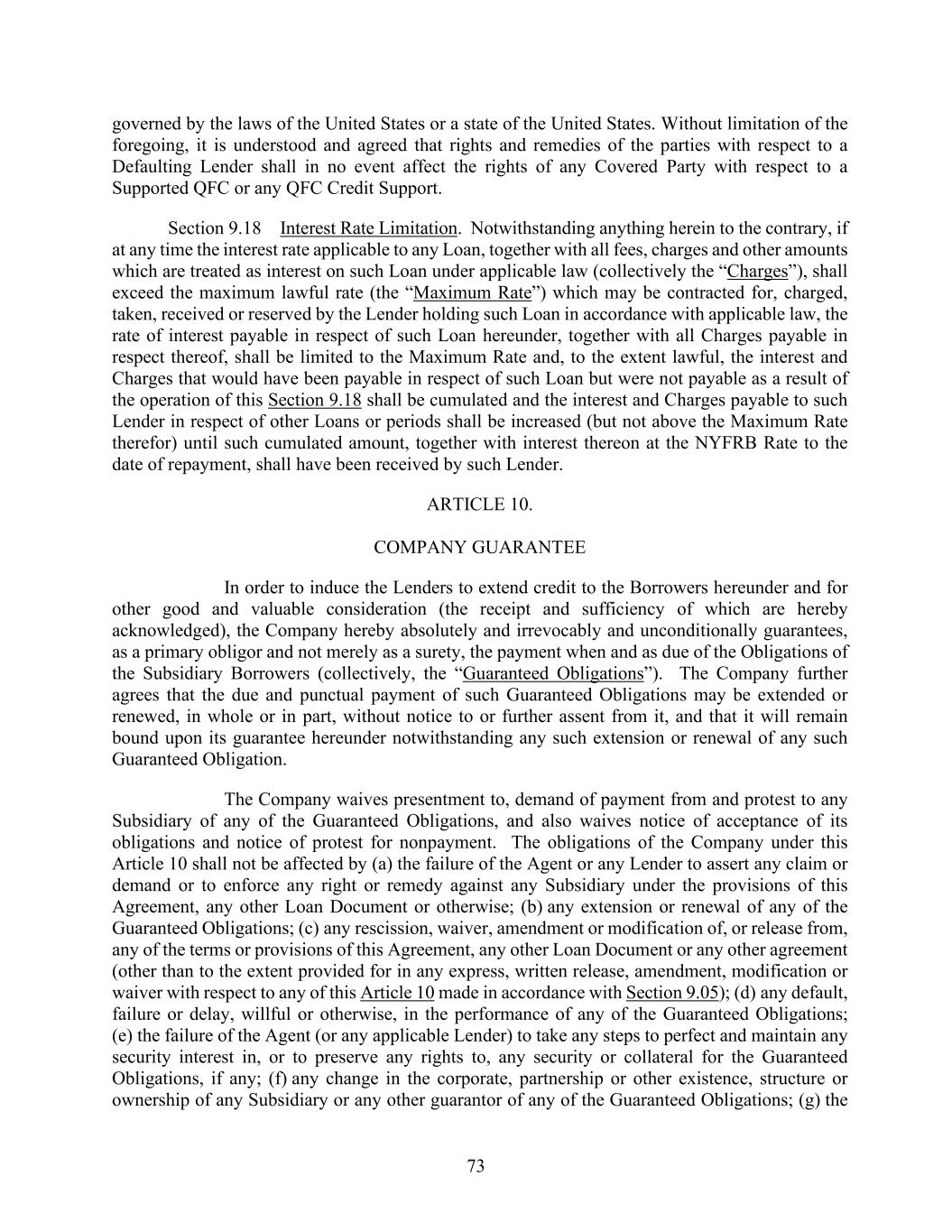 73 governed by the laws of the United States or a state of the United States. Without limitation of the foregoing, it is understood and agreed that rights and remedies of the parties with respect to a Defaulting Lender shall in no event affect the rights of any Covered Party with respect to a Supported QFC or any QFC Credit Support. Section 9.18 Interest Rate Limitation. Notwithstanding anything herein to the contrary, if at any time the interest rate applicable to any Loan, together with all fees, charges and other amounts which are treated as interest on such Loan under applicable law (collectively the “Charges”), shall exceed the maximum lawful rate (the “Maximum Rate”) which may be contracted for, charged, taken, received or reserved by the Lender holding such Loan in accordance with applicable law, the rate of interest payable in respect of such Loan hereunder, together with all Charges payable in respect thereof, shall be limited to the Maximum Rate and, to the extent lawful, the interest and Charges that would have been payable in respect of such Loan but were not payable as a result of the operation of this Section 9.18 shall be cumulated and the interest and Charges payable to such Lender in respect of other Loans or periods shall be increased (but not above the Maximum Rate therefor) until such cumulated amount, together with interest thereon at the NYFRB Rate to the date of repayment, shall have been received by such Lender. ARTICLE 10. COMPANY GUARANTEE In order to induce the Lenders to extend credit to the Borrowers hereunder and for other good and valuable consideration (the receipt and sufficiency of which are hereby acknowledged), the Company hereby absolutely and irrevocably and unconditionally guarantees, as a primary obligor and not merely as a surety, the payment when and as due of the Obligations of the Subsidiary Borrowers (collectively, the “Guaranteed Obligations”). The Company further agrees that the due and punctual payment of such Guaranteed Obligations may be extended or renewed, in whole or in part, without notice to or further assent from it, and that it will remain bound upon its guarantee hereunder notwithstanding any such extension or renewal of any such Guaranteed Obligation. The Company waives presentment to, demand of payment from and protest to any Subsidiary of any of the Guaranteed Obligations, and also waives notice of acceptance of its obligations and notice of protest for nonpayment. The obligations of the Company under this Article 10 shall not be affected by (a) the failure of the Agent or any Lender to assert any claim or demand or to enforce any right or remedy against any Subsidiary under the provisions of this Agreement, any other Loan Document or otherwise; (b) any extension or renewal of any of the Guaranteed Obligations; (c) any rescission, waiver, amendment or modification of, or release from, any of the terms or provisions of this Agreement, any other Loan Document or any other agreement (other than to the extent provided for in any express, written release, amendment, modification or waiver with respect to any of this Article 10 made in accordance with Section 9.05); (d) any default, failure or delay, willful or otherwise, in the performance of any of the Guaranteed Obligations; (e) the failure of the Agent (or any applicable Lender) to take any steps to perfect and maintain any security interest in, or to preserve any rights to, any security or collateral for the Guaranteed Obligations, if any; (f) any change in the corporate, partnership or other existence, structure or ownership of any Subsidiary or any other guarantor of any of the Guaranteed Obligations; (g) the