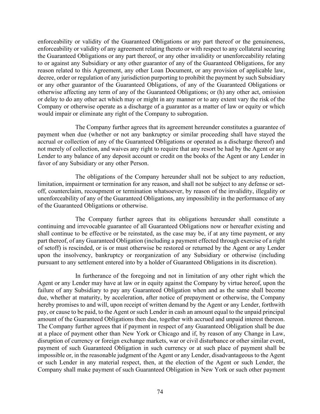 74 enforceability or validity of the Guaranteed Obligations or any part thereof or the genuineness, enforceability or validity of any agreement relating thereto or with respect to any collateral securing the Guaranteed Obligations or any part thereof, or any other invalidity or unenforceability relating to or against any Subsidiary or any other guarantor of any of the Guaranteed Obligations, for any reason related to this Agreement, any other Loan Document, or any provision of applicable law, decree, order or regulation of any jurisdiction purporting to prohibit the payment by such Subsidiary or any other guarantor of the Guaranteed Obligations, of any of the Guaranteed Obligations or otherwise affecting any term of any of the Guaranteed Obligations; or (h) any other act, omission or delay to do any other act which may or might in any manner or to any extent vary the risk of the Company or otherwise operate as a discharge of a guarantor as a matter of law or equity or which would impair or eliminate any right of the Company to subrogation. The Company further agrees that its agreement hereunder constitutes a guarantee of payment when due (whether or not any bankruptcy or similar proceeding shall have stayed the accrual or collection of any of the Guaranteed Obligations or operated as a discharge thereof) and not merely of collection, and waives any right to require that any resort be had by the Agent or any Lender to any balance of any deposit account or credit on the books of the Agent or any Lender in favor of any Subsidiary or any other Person. The obligations of the Company hereunder shall not be subject to any reduction, limitation, impairment or termination for any reason, and shall not be subject to any defense or set- off, counterclaim, recoupment or termination whatsoever, by reason of the invalidity, illegality or unenforceability of any of the Guaranteed Obligations, any impossibility in the performance of any of the Guaranteed Obligations or otherwise. The Company further agrees that its obligations hereunder shall constitute a continuing and irrevocable guarantee of all Guaranteed Obligations now or hereafter existing and shall continue to be effective or be reinstated, as the case may be, if at any time payment, or any part thereof, of any Guaranteed Obligation (including a payment effected through exercise of a right of setoff) is rescinded, or is or must otherwise be restored or returned by the Agent or any Lender upon the insolvency, bankruptcy or reorganization of any Subsidiary or otherwise (including pursuant to any settlement entered into by a holder of Guaranteed Obligations in its discretion). In furtherance of the foregoing and not in limitation of any other right which the Agent or any Lender may have at law or in equity against the Company by virtue hereof, upon the failure of any Subsidiary to pay any Guaranteed Obligation when and as the same shall become due, whether at maturity, by acceleration, after notice of prepayment or otherwise, the Company hereby promises to and will, upon receipt of written demand by the Agent or any Lender, forthwith pay, or cause to be paid, to the Agent or such Lender in cash an amount equal to the unpaid principal amount of the Guaranteed Obligations then due, together with accrued and unpaid interest thereon. The Company further agrees that if payment in respect of any Guaranteed Obligation shall be due at a place of payment other than New York or Chicago and if, by reason of any Change in Law, disruption of currency or foreign exchange markets, war or civil disturbance or other similar event, payment of such Guaranteed Obligation in such currency or at such place of payment shall be impossible or, in the reasonable judgment of the Agent or any Lender, disadvantageous to the Agent or such Lender in any material respect, then, at the election of the Agent or such Lender, the Company shall make payment of such Guaranteed Obligation in New York or such other payment