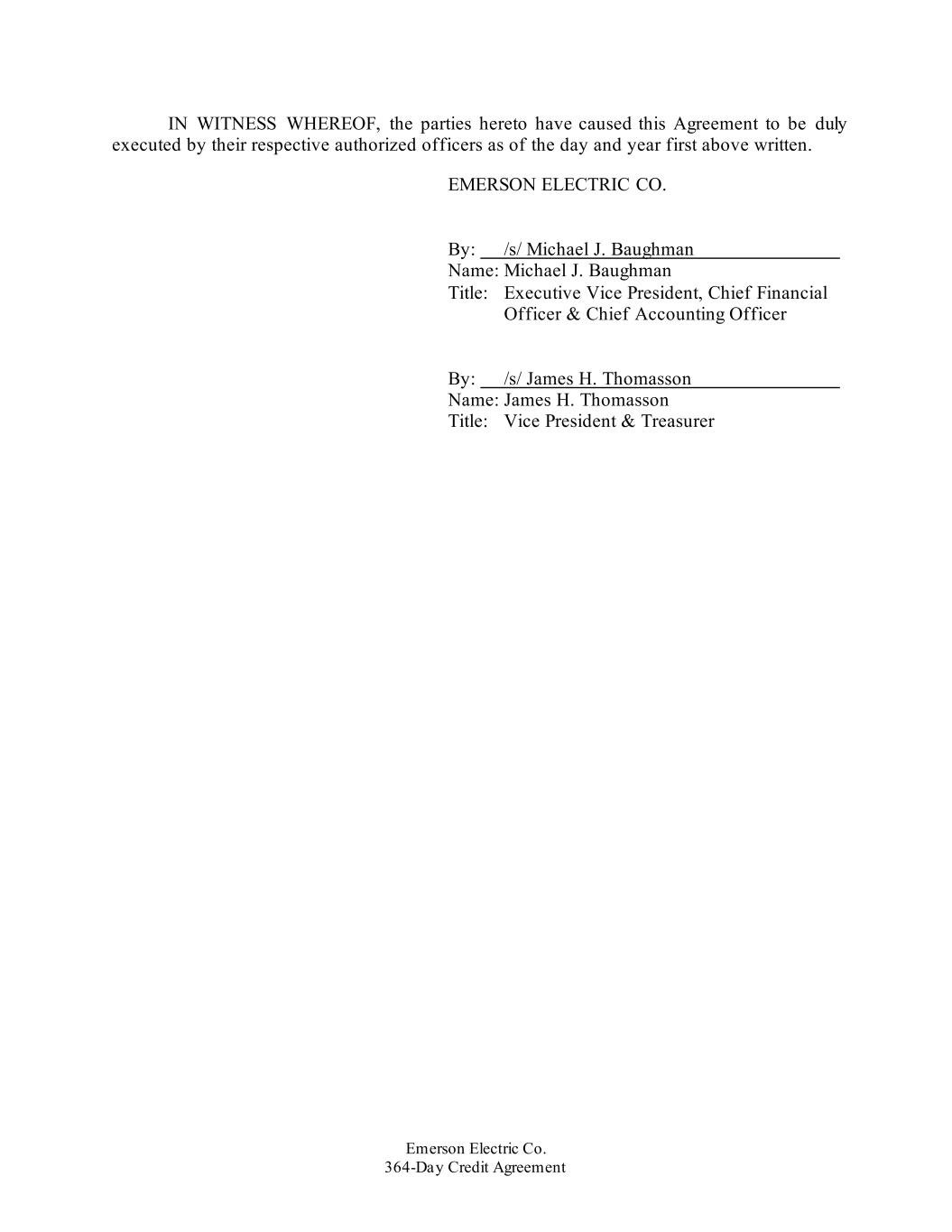 Emerson Electric Co. 364-Day Credit Agreement IN WITNESS WHEREOF, the parties hereto have caused this Agreement to be duly executed by their respective authorized officers as of the day and year first above written. EMERSON ELECTRIC CO. By: /s/ Michael J. Baughman Name: Michael J. Baughman Title: Executive Vice President, Chief Financial Officer & Chief Accounting Officer By: /s/ James H. Thomasson Name: James H. Thomasson Title: Vice President & Treasurer