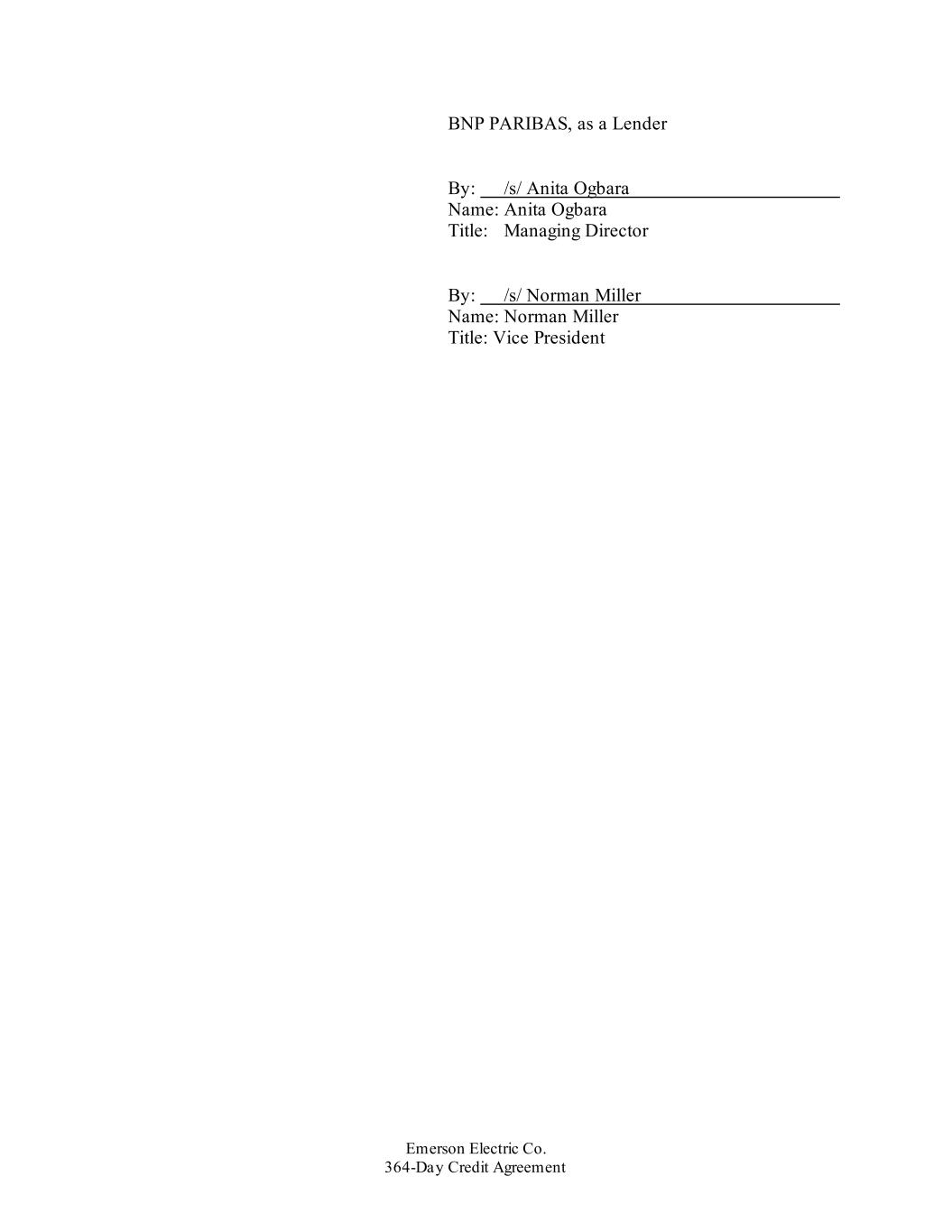 Emerson Electric Co. 364-Day Credit Agreement BNP PARIBAS, as a Lender By: /s/ Anita Ogbara Name: Anita Ogbara Title: Managing Director By: /s/ Norman Miller Name: Norman Miller Title: Vice President