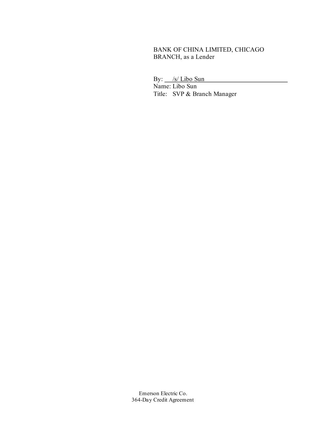 Emerson Electric Co. 364-Day Credit Agreement BANK OF CHINA LIMITED, CHICAGO BRANCH, as a Lender By: /s/ Libo Sun Name: Libo Sun Title: SVP & Branch Manager