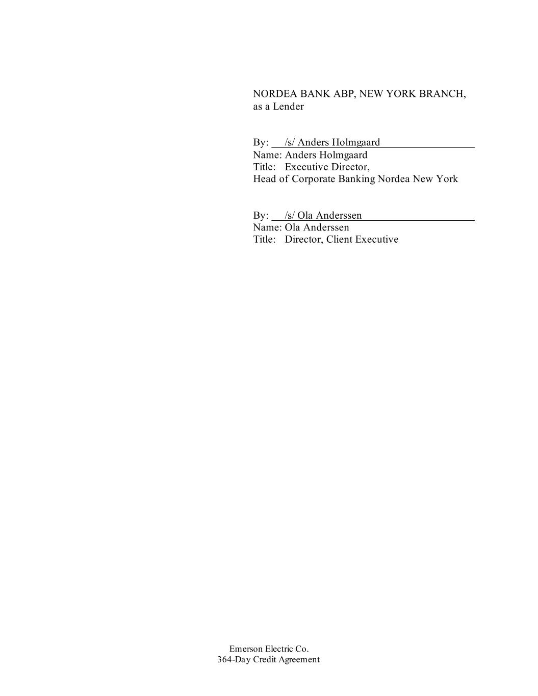Emerson Electric Co. 364-Day Credit Agreement NORDEA BANK ABP, NEW YORK BRANCH, as a Lender By: /s/ Anders Holmgaard Name: Anders Holmgaard Title: Executive Director, Head of Corporate Banking Nordea New York By: /s/ Ola Anderssen Name: Ola Anderssen Title: Director, Client Executive