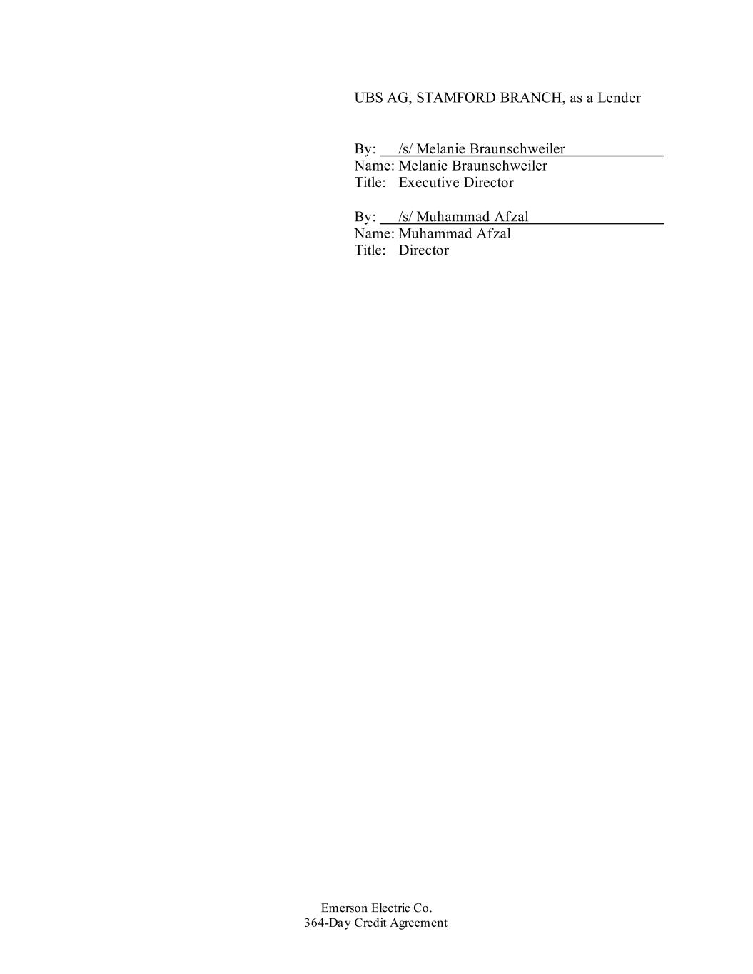 Emerson Electric Co. 364-Day Credit Agreement UBS AG, STAMFORD BRANCH, as a Lender By: /s/ Melanie Braunschweiler Name: Melanie Braunschweiler Title: Executive Director By: /s/ Muhammad Afzal Name: Muhammad Afzal Title: Director