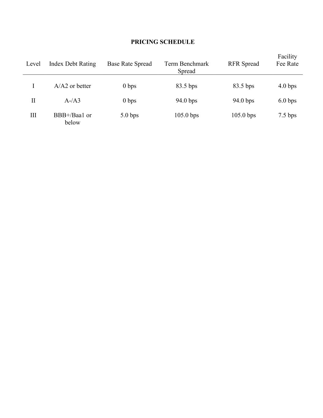 PRICING SCHEDULE Level Index Debt Rating Base Rate Spread Term Benchmark Spread RFR Spread Facility Fee Rate I A/A2 or better 0 bps 83.5 bps 83.5 bps 4.0 bps II A-/A3 0 bps 94.0 bps 94.0 bps 6.0 bps III BBB+/Baa1 or below 5.0 bps 105.0 bps 105.0 bps 7.5 bps