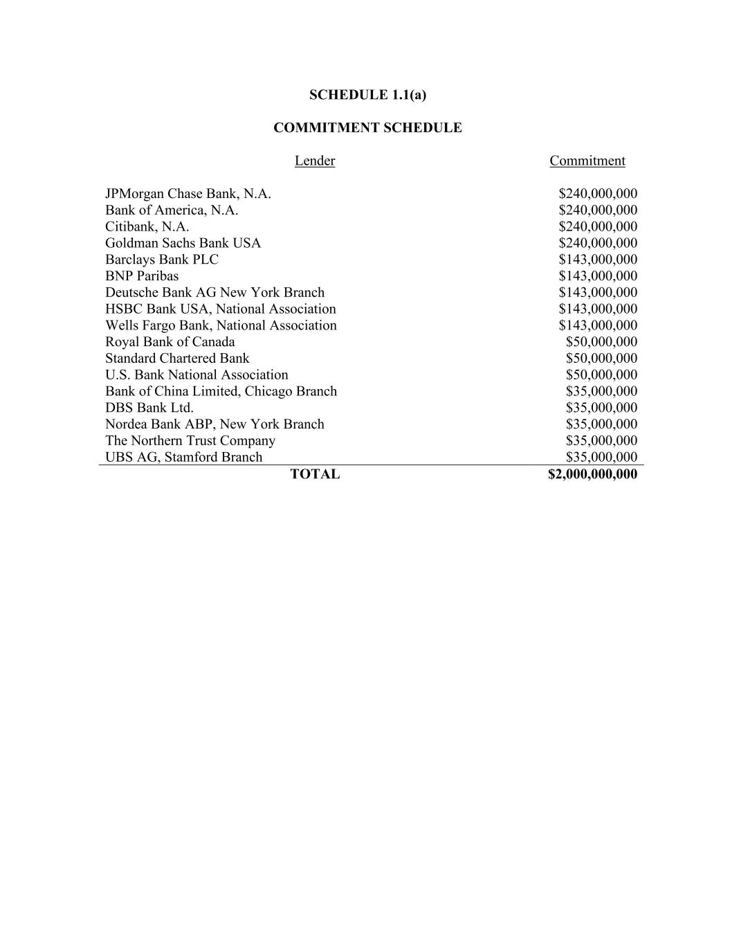 SCHEDULE 1.1(a) COMMITMENT SCHEDULE Lender Commitment JPMorgan Chase Bank, N.A. $240,000,000 Bank of America, N.A. $240,000,000 Citibank, N.A. $240,000,000 Goldman Sachs Bank USA $240,000,000 Barclays Bank PLC $143,000,000 BNP Paribas $143,000,000 Deutsche Bank AG New York Branch $143,000,000 HSBC Bank USA, National Association $143,000,000 Wells Fargo Bank, National Association $143,000,000 Royal Bank of Canada $50,000,000 Standard Chartered Bank $50,000,000 U.S. Bank National Association $50,000,000 Bank of China Limited, Chicago Branch $35,000,000 DBS Bank Ltd. $35,000,000 Nordea Bank ABP, New York Branch $35,000,000 The Northern Trust Company $35,000,000 UBS AG, Stamford Branch $35,000,000 TOTAL $2,000,000,000