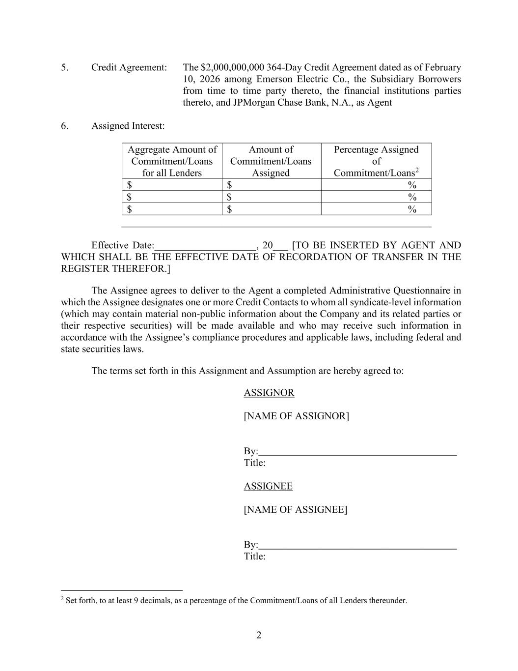 2 5. Credit Agreement: The $2,000,000,000 364-Day Credit Agreement dated as of February 10, 2026 among Emerson Electric Co., the Subsidiary Borrowers from time to time party thereto, the financial institutions parties thereto, and JPMorgan Chase Bank, N.A., as Agent 6. Assigned Interest: Aggregate Amount of Commitment/Loans for all Lenders Amount of Commitment/Loans Assigned Percentage Assigned of Commitment/Loans2 $ $ % $ $ % $ $ % Effective Date:____________________, 20___ [TO BE INSERTED BY AGENT AND WHICH SHALL BE THE EFFECTIVE DATE OF RECORDATION OF TRANSFER IN THE REGISTER THEREFOR.] The Assignee agrees to deliver to the Agent a completed Administrative Questionnaire in which the Assignee designates one or more Credit Contacts to whom all syndicate-level information (which may contain material non-public information about the Company and its related parties or their respective securities) will be made available and who may receive such information in accordance with the Assignee’s compliance procedures and applicable laws, including federal and state securities laws. The terms set forth in this Assignment and Assumption are hereby agreed to: ASSIGNOR [NAME OF ASSIGNOR] By: Title: ASSIGNEE [NAME OF ASSIGNEE] By: Title: 2 Set forth, to at least 9 decimals, as a percentage of the Commitment/Loans of all Lenders thereunder.