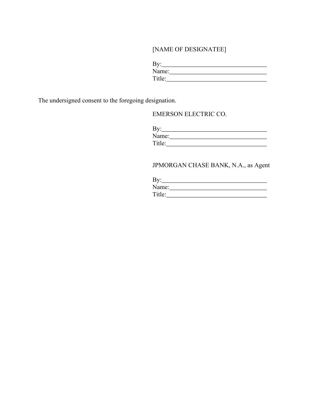 [NAME OF DESIGNATEE] By: Name: Title: The undersigned consent to the foregoing designation. EMERSON ELECTRIC CO. By: Name: Title: JPMORGAN CHASE BANK, N.A., as Agent By: Name: Title: