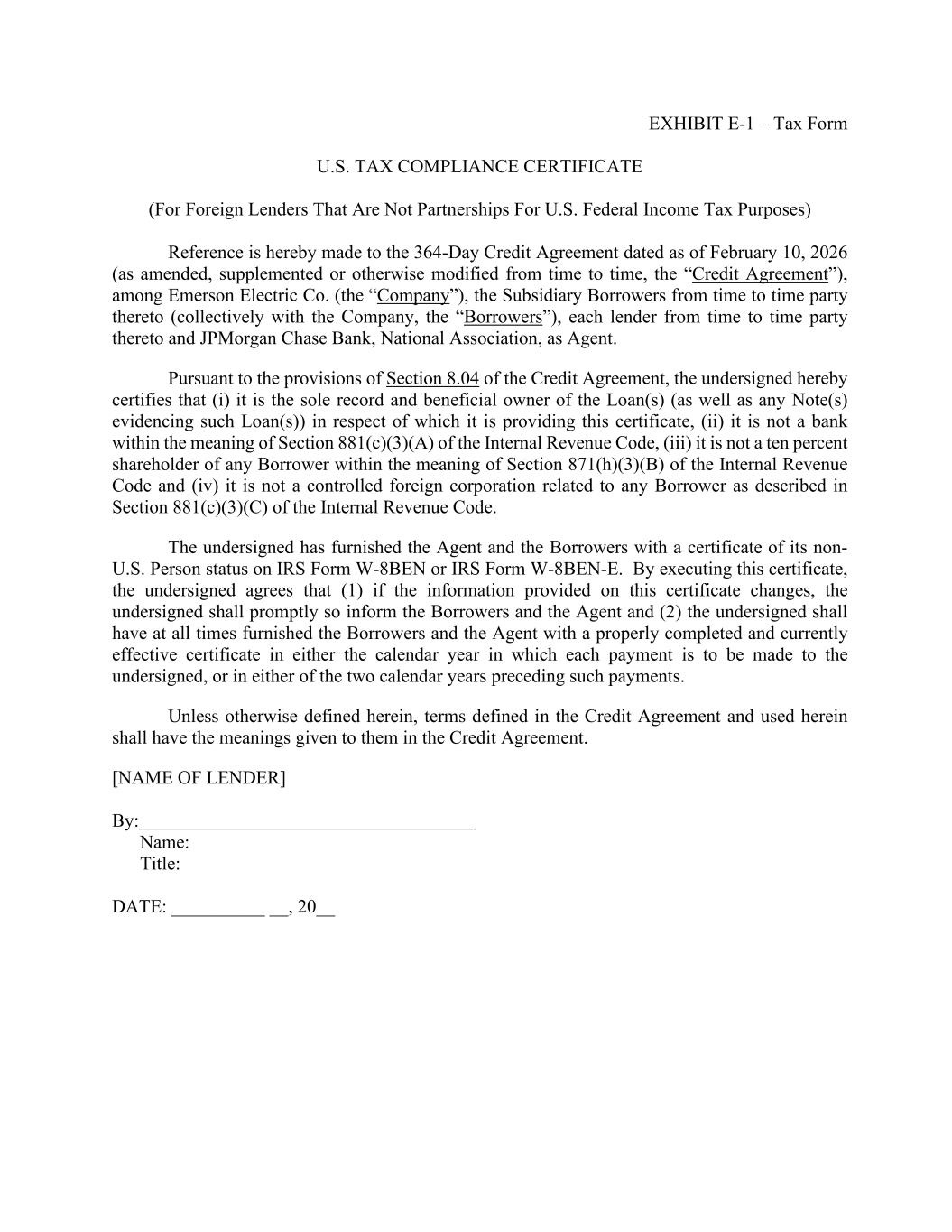 EXHIBIT E-1 – Tax Form U.S. TAX COMPLIANCE CERTIFICATE (For Foreign Lenders That Are Not Partnerships For U.S. Federal Income Tax Purposes) Reference is hereby made to the 364-Day Credit Agreement dated as of February 10, 2026 (as amended, supplemented or otherwise modified from time to time, the “Credit Agreement”), among Emerson Electric Co. (the “Company”), the Subsidiary Borrowers from time to time party thereto (collectively with the Company, the “Borrowers”), each lender from time to time party thereto and JPMorgan Chase Bank, National Association, as Agent. Pursuant to the provisions of Section 8.04 of the Credit Agreement, the undersigned hereby certifies that (i) it is the sole record and beneficial owner of the Loan(s) (as well as any Note(s) evidencing such Loan(s)) in respect of which it is providing this certificate, (ii) it is not a bank within the meaning of Section 881(c)(3)(A) of the Internal Revenue Code, (iii) it is not a ten percent shareholder of any Borrower within the meaning of Section 871(h)(3)(B) of the Internal Revenue Code and (iv) it is not a controlled foreign corporation related to any Borrower as described in Section 881(c)(3)(C) of the Internal Revenue Code. The undersigned has furnished the Agent and the Borrowers with a certificate of its non- U.S. Person status on IRS Form W-8BEN or IRS Form W-8BEN-E. By executing this certificate, the undersigned agrees that (1) if the information provided on this certificate changes, the undersigned shall promptly so inform the Borrowers and the Agent and (2) the undersigned shall have at all times furnished the Borrowers and the Agent with a properly completed and currently effective certificate in either the calendar year in which each payment is to be made to the undersigned, or in either of the two calendar years preceding such payments. Unless otherwise defined herein, terms defined in the Credit Agreement and used herein shall have the meanings given to them in the Credit Agreement. [NAME OF LENDER] By: Name: Title: DATE: __________ __, 20__