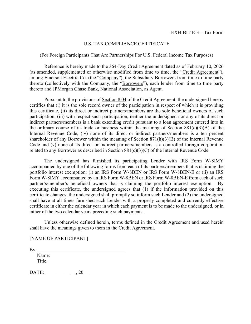 EXHIBIT E-3 – Tax Form U.S. TAX COMPLIANCE CERTIFICATE (For Foreign Participants That Are Partnerships For U.S. Federal Income Tax Purposes) Reference is hereby made to the 364-Day Credit Agreement dated as of February 10, 2026 (as amended, supplemented or otherwise modified from time to time, the “Credit Agreement”), among Emerson Electric Co. (the “Company”), the Subsidiary Borrowers from time to time party thereto (collectively with the Company, the “Borrowers”), each lender from time to time party thereto and JPMorgan Chase Bank, National Association, as Agent. Pursuant to the provisions of Section 8.04 of the Credit Agreement, the undersigned hereby certifies that (i) it is the sole record owner of the participation in respect of which it is providing this certificate, (ii) its direct or indirect partners/members are the sole beneficial owners of such participation, (iii) with respect such participation, neither the undersigned nor any of its direct or indirect partners/members is a bank extending credit pursuant to a loan agreement entered into in the ordinary course of its trade or business within the meaning of Section 881(c)(3)(A) of the Internal Revenue Code, (iv) none of its direct or indirect partners/members is a ten percent shareholder of any Borrower within the meaning of Section 871(h)(3)(B) of the Internal Revenue Code and (v) none of its direct or indirect partners/members is a controlled foreign corporation related to any Borrower as described in Section 881(c)(3)(C) of the Internal Revenue Code. The undersigned has furnished its participating Lender with IRS Form W-8IMY accompanied by one of the following forms from each of its partners/members that is claiming the portfolio interest exemption: (i) an IRS Form W-8BEN or IRS Form W-8BEN-E or (ii) an IRS Form W-8IMY accompanied by an IRS Form W-8BEN or IRS Form W-8BEN-E from each of such partner’s/member’s beneficial owners that is claiming the portfolio interest exemption. By executing this certificate, the undersigned agrees that (1) if the information provided on this certificate changes, the undersigned shall promptly so inform such Lender and (2) the undersigned shall have at all times furnished such Lender with a properly completed and currently effective certificate in either the calendar year in which each payment is to be made to the undersigned, or in either of the two calendar years preceding such payments. Unless otherwise defined herein, terms defined in the Credit Agreement and used herein shall have the meanings given to them in the Credit Agreement. [NAME OF PARTICIPANT] By: Name: Title: DATE: __________ __, 20__
