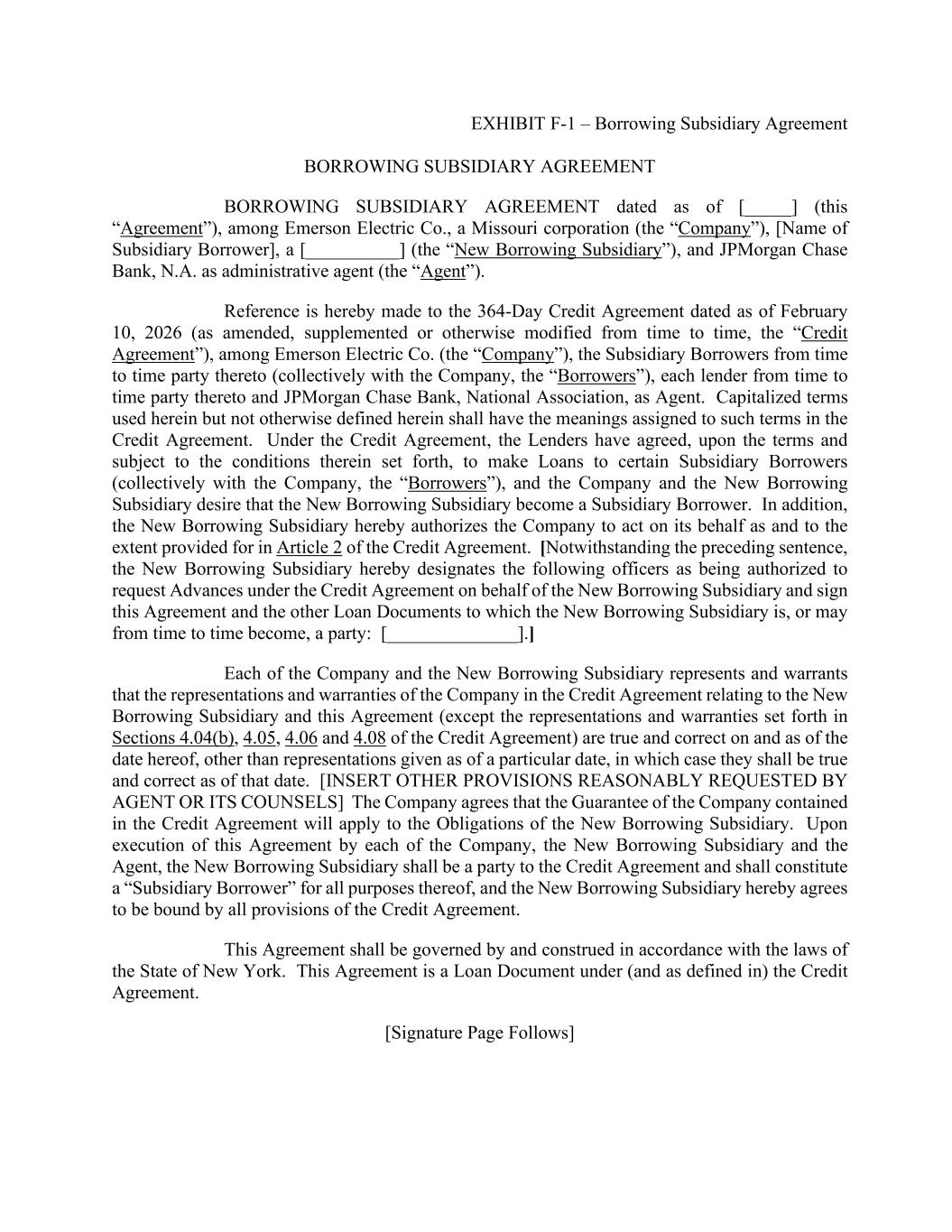 EXHIBIT F-1 – Borrowing Subsidiary Agreement BORROWING SUBSIDIARY AGREEMENT BORROWING SUBSIDIARY AGREEMENT dated as of [_____] (this “Agreement”), among Emerson Electric Co., a Missouri corporation (the “Company”), [Name of Subsidiary Borrower], a [__________] (the “New Borrowing Subsidiary”), and JPMorgan Chase Bank, N.A. as administrative agent (the “Agent”). Reference is hereby made to the 364-Day Credit Agreement dated as of February 10, 2026 (as amended, supplemented or otherwise modified from time to time, the “Credit Agreement”), among Emerson Electric Co. (the “Company”), the Subsidiary Borrowers from time to time party thereto (collectively with the Company, the “Borrowers”), each lender from time to time party thereto and JPMorgan Chase Bank, National Association, as Agent. Capitalized terms used herein but not otherwise defined herein shall have the meanings assigned to such terms in the Credit Agreement. Under the Credit Agreement, the Lenders have agreed, upon the terms and subject to the conditions therein set forth, to make Loans to certain Subsidiary Borrowers (collectively with the Company, the “Borrowers”), and the Company and the New Borrowing Subsidiary desire that the New Borrowing Subsidiary become a Subsidiary Borrower. In addition, the New Borrowing Subsidiary hereby authorizes the Company to act on its behalf as and to the extent provided for in Article 2 of the Credit Agreement. [Notwithstanding the preceding sentence, the New Borrowing Subsidiary hereby designates the following officers as being authorized to request Advances under the Credit Agreement on behalf of the New Borrowing Subsidiary and sign this Agreement and the other Loan Documents to which the New Borrowing Subsidiary is, or may from time to time become, a party: [______________].] Each of the Company and the New Borrowing Subsidiary represents and warrants that the representations and warranties of the Company in the Credit Agreement relating to the New Borrowing Subsidiary and this Agreement (except the representations and warranties set forth in Sections 4.04(b), 4.05, 4.06 and 4.08 of the Credit Agreement) are true and correct on and as of the date hereof, other than representations given as of a particular date, in which case they shall be true and correct as of that date. [INSERT OTHER PROVISIONS REASONABLY REQUESTED BY AGENT OR ITS COUNSELS] The Company agrees that the Guarantee of the Company contained in the Credit Agreement will apply to the Obligations of the New Borrowing Subsidiary. Upon execution of this Agreement by each of the Company, the New Borrowing Subsidiary and the Agent, the New Borrowing Subsidiary shall be a party to the Credit Agreement and shall constitute a “Subsidiary Borrower” for all purposes thereof, and the New Borrowing Subsidiary hereby agrees to be bound by all provisions of the Credit Agreement. This Agreement shall be governed by and construed in accordance with the laws of the State of New York. This Agreement is a Loan Document under (and as defined in) the Credit Agreement. [Signature Page Follows]