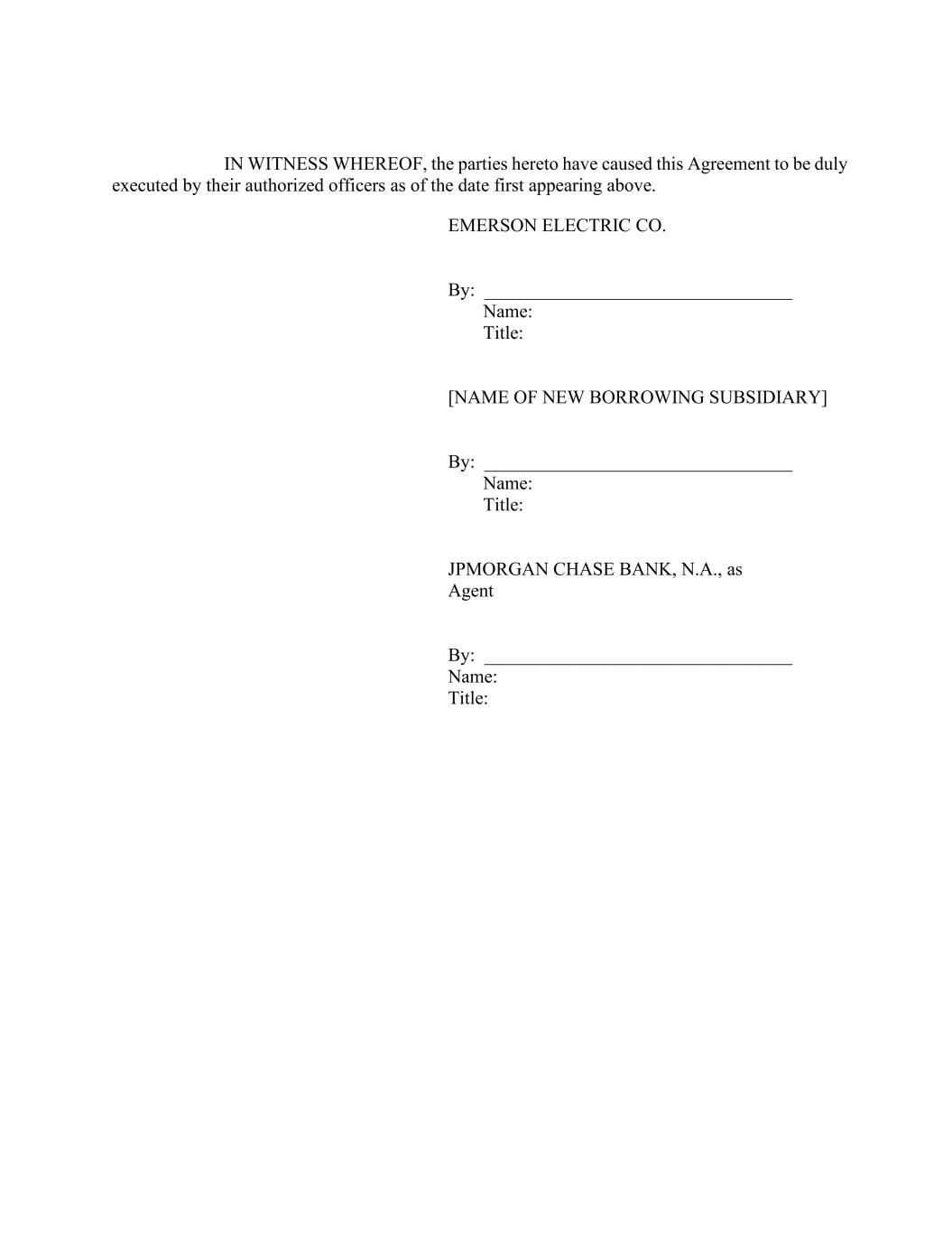 IN WITNESS WHEREOF, the parties hereto have caused this Agreement to be duly executed by their authorized officers as of the date first appearing above. EMERSON ELECTRIC CO. By: _________________________________ Name: Title: [NAME OF NEW BORROWING SUBSIDIARY] By: _________________________________ Name: Title: JPMORGAN CHASE BANK, N.A., as Agent By: _________________________________ Name: Title: