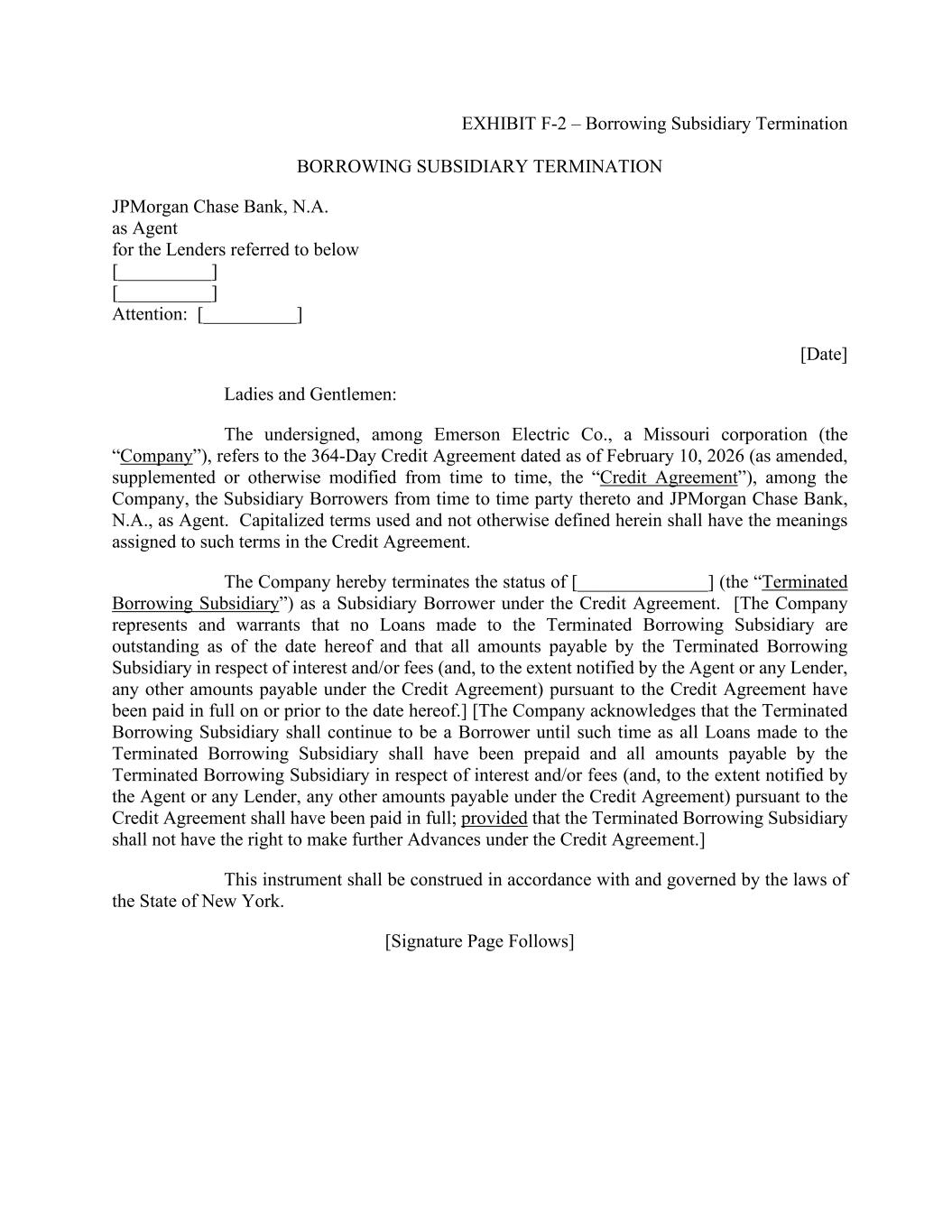 EXHIBIT F-2 – Borrowing Subsidiary Termination BORROWING SUBSIDIARY TERMINATION JPMorgan Chase Bank, N.A. as Agent for the Lenders referred to below [__________] [__________] Attention: [__________] [Date] Ladies and Gentlemen: The undersigned, among Emerson Electric Co., a Missouri corporation (the “Company”), refers to the 364-Day Credit Agreement dated as of February 10, 2026 (as amended, supplemented or otherwise modified from time to time, the “Credit Agreement”), among the Company, the Subsidiary Borrowers from time to time party thereto and JPMorgan Chase Bank, N.A., as Agent. Capitalized terms used and not otherwise defined herein shall have the meanings assigned to such terms in the Credit Agreement. The Company hereby terminates the status of [______________] (the “Terminated Borrowing Subsidiary”) as a Subsidiary Borrower under the Credit Agreement. [The Company represents and warrants that no Loans made to the Terminated Borrowing Subsidiary are outstanding as of the date hereof and that all amounts payable by the Terminated Borrowing Subsidiary in respect of interest and/or fees (and, to the extent notified by the Agent or any Lender, any other amounts payable under the Credit Agreement) pursuant to the Credit Agreement have been paid in full on or prior to the date hereof.] [The Company acknowledges that the Terminated Borrowing Subsidiary shall continue to be a Borrower until such time as all Loans made to the Terminated Borrowing Subsidiary shall have been prepaid and all amounts payable by the Terminated Borrowing Subsidiary in respect of interest and/or fees (and, to the extent notified by the Agent or any Lender, any other amounts payable under the Credit Agreement) pursuant to the Credit Agreement shall have been paid in full; provided that the Terminated Borrowing Subsidiary shall not have the right to make further Advances under the Credit Agreement.] This instrument shall be construed in accordance with and governed by the laws of the State of New York. [Signature Page Follows]