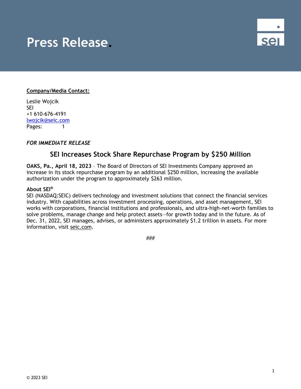 © 2023 SEI 1 Company/Media Contact: Leslie Wojcik SEI +1 610-676-4191 lwojcik@seic.com Pages: 1 FOR IMMEDIATE RELEASE SEI Increases Stock Share Repurchase Program by $250 Million OAKS, Pa., April 18, 2023 – The Board of Directors of SEI Investments Company approved an increase in its stock repurchase program by an additional $250 million, increasing the available authorization under the program to approximately $263 million. About SEI® SEI (NASDAQ:SEIC) delivers technology and investment solutions that connect the financial services industry. With capabilities across investment processing, operations, and asset management, SEI works with corporations, financial institutions and professionals, and ultra-high-net-worth families to solve problems, manage change and help protect assets—for growth today and in the future. As of Dec. 31, 2022, SEI manages, advises, or administers approximately $1.2 trillion in assets. For more information, visit seic.com. ### Press Release.