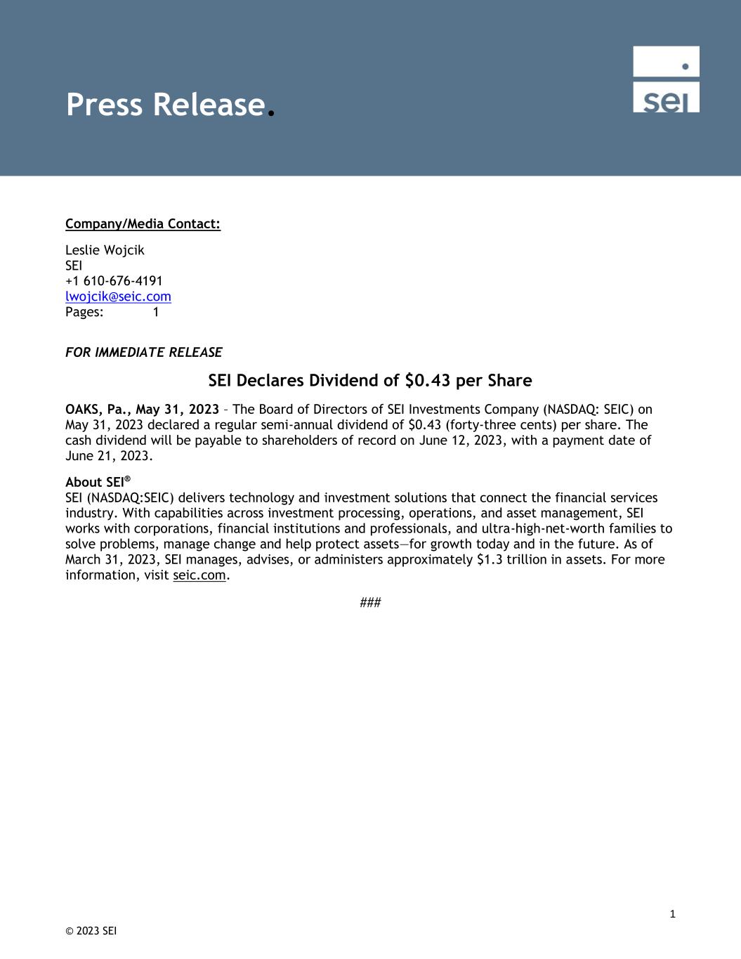 © 2023 SEI 1 Company/Media Contact: Leslie Wojcik SEI +1 610-676-4191 lwojcik@seic.com Pages: 1 FOR IMMEDIATE RELEASE SEI Declares Dividend of $0.43 per Share OAKS, Pa., May 31, 2023 – The Board of Directors of SEI Investments Company (NASDAQ: SEIC) on May 31, 2023 declared a regular semi-annual dividend of $0.43 (forty-three cents) per share. The cash dividend will be payable to shareholders of record on June 12, 2023, with a payment date of June 21, 2023. About SEI® SEI (NASDAQ:SEIC) delivers technology and investment solutions that connect the financial services industry. With capabilities across investment processing, operations, and asset management, SEI works with corporations, financial institutions and professionals, and ultra-high-net-worth families to solve problems, manage change and help protect assets—for growth today and in the future. As of March 31, 2023, SEI manages, advises, or administers approximately $1.3 trillion in assets. For more information, visit seic.com. ### Press Release.