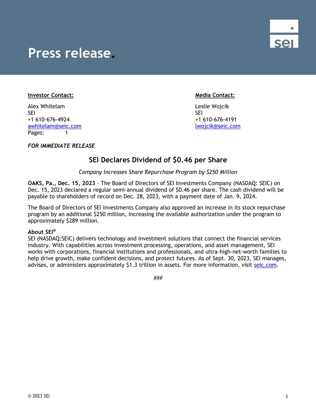 © 2023 SEI 1 Investor Contact: Media Contact: Alex Whitelam Leslie Wojcik SEI SEI +1 610-676-4924 +1 610-676-4191 awhitelam@seic.com lwojcik@seic.com Pages: 1 FOR IMMEDIATE RELEASE SEI Declares Dividend of $0.46 per Share Company Increases Share Repurchase Program by $250 Million OAKS, Pa., Dec. 15, 2023 – The Board of Directors of SEI Investments Company (NASDAQ: SEIC) on Dec. 15, 2023 declared a regular semi-annual dividend of $0.46 per share. The cash dividend will be payable to shareholders of record on Dec. 28, 2023, with a payment date of Jan. 9, 2024. The Board of Directors of SEI Investments Company also approved an increase in its stock repurchase program by an additional $250 million, increasing the available authorization under the program to approximately $289 million. About SEI® SEI (NASDAQ:SEIC) delivers technology and investment solutions that connect the financial services industry. With capabilities across investment processing, operations, and asset management, SEI works with corporations, financial institutions and professionals, and ultra-high-net-worth families to help drive growth, make confident decisions, and protect futures. As of Sept. 30, 2023, SEI manages, advises, or administers approximately $1.3 trillion in assets. For more information, visit seic.com. ### Press release.