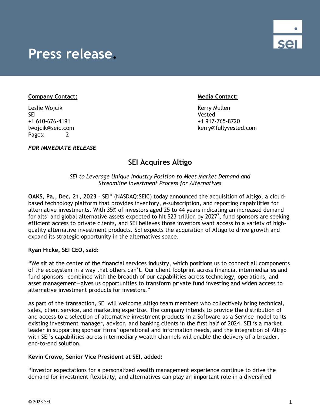 © 2023 SEI 1 Company Contact: Media Contact: Leslie Wojcik Kerry Mullen SEI Vested +1 610-676-4191 +1 917-765-8720 lwojcik@seic.com kerry@fullyvested.com Pages: 2 FOR IMMEDIATE RELEASE SEI Acquires Altigo SEI to Leverage Unique Industry Position to Meet Market Demand and Streamline Investment Process for Alternatives OAKS, Pa., Dec. 21, 2023 – SEI® (NASDAQ:SEIC) today announced the acquisition of Altigo, a cloud- based technology platform that provides inventory, e-subscription, and reporting capabilities for alternative investments. With 35% of investors aged 25 to 44 years indicating an increased demand for alts1 and global alternative assets expected to hit $23 trillion by 20272, fund sponsors are seeking efficient access to private clients, and SEI believes those investors want access to a variety of high- quality alternative investment products. SEI expects the acquisition of Altigo to drive growth and expand its strategic opportunity in the alternatives space. Ryan Hicke, SEI CEO, said: “We sit at the center of the financial services industry, which positions us to connect all components of the ecosystem in a way that others can’t. Our client footprint across financial intermediaries and fund sponsors—combined with the breadth of our capabilities across technology, operations, and asset management—gives us opportunities to transform private fund investing and widen access to alternative investment products for investors.” As part of the transaction, SEI will welcome Altigo team members who collectively bring technical, sales, client service, and marketing expertise. The company intends to provide the distribution of and access to a selection of alternative investment products in a Software-as-a-Service model to its existing investment manager, advisor, and banking clients in the first half of 2024. SEI is a market leader in supporting sponsor firms’ operational and information needs, and the integration of Altigo with SEI’s capabilities across intermediary wealth channels will enable the delivery of a broader, end-to-end solution. Kevin Crowe, Senior Vice President at SEI, added: “Investor expectations for a personalized wealth management experience continue to drive the demand for investment flexibility, and alternatives can play an important role in a diversified Press release.
