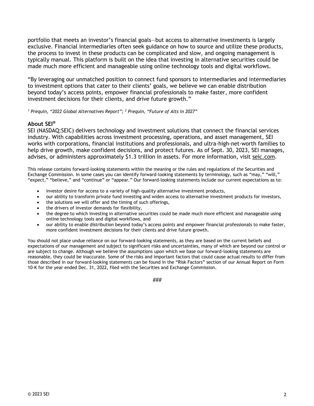 © 2023 SEI 2 portfolio that meets an investor’s financial goals—but access to alternative investments is largely exclusive. Financial intermediaries often seek guidance on how to source and utilize these products, the process to invest in these products can be complicated and slow, and ongoing management is typically manual. This platform is built on the idea that investing in alternative securities could be made much more efficient and manageable using online technology tools and digital workflows. “By leveraging our unmatched position to connect fund sponsors to intermediaries and intermediaries to investment options that cater to their clients’ goals, we believe we can enable distribution beyond today’s access points, empower financial professionals to make faster, more confident investment decisions for their clients, and drive future growth.” 1 Prequin, “2022 Global Alternatives Report”; 2 Prequin, “Future of Alts in 2027” About SEI® SEI (NASDAQ:SEIC) delivers technology and investment solutions that connect the financial services industry. With capabilities across investment processing, operations, and asset management, SEI works with corporations, financial institutions and professionals, and ultra-high-net-worth families to help drive growth, make confident decisions, and protect futures. As of Sept. 30, 2023, SEI manages, advises, or administers approximately $1.3 trillion in assets. For more information, visit seic.com. This release contains forward-looking statements within the meaning or the rules and regulations of the Securities and Exchange Commission. In some cases you can identify forward-looking statements by terminology, such as “may,” “will,” “expect,” “believe,” and “continue” or “appear.” Our forward-looking statements include our current expectations as to:  investor desire for access to a variety of high-quality alternative investment products,  our ability to transform private fund investing and widen access to alternative investment products for investors,  the solutions we will offer and the timing of such offerings,  the drivers of investor demands for flexibility,  the degree to which investing in alternative securities could be made much more efficient and manageable using online technology tools and digital workflows, and  our ability to enable distribution beyond today’s access points and empower financial professionals to make faster, more confident investment decisions for their clients and drive future growth. You should not place undue reliance on our forward-looking statements, as they are based on the current beliefs and expectations of our management and subject to significant risks and uncertainties, many of which are beyond our control or are subject to change. Although we believe the assumptions upon which we base our forward-looking statements are reasonable, they could be inaccurate. Some of the risks and important factors that could cause actual results to differ from those described in our forward-looking statements can be found in the “Risk Factors” section of our Annual Report on Form 10-K for the year ended Dec. 31, 2022, filed with the Securities and Exchange Commission. ###