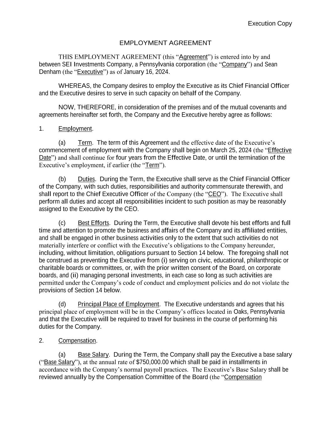 Execution Copy EMPLOYMENT AGREEMENT THIS EMPLOYMENT AGREEMENT (this “Agreement”) is entered into by and between SEI Investments Company, a Pennsylvania corporation (the “Company”) and Sean Denham (the “Executive”) as of January 16, 2024. WHEREAS, the Company desires to employ the Executive as its Chief Financial Officer and the Executive desires to serve in such capacity on behalf of the Company. NOW, THEREFORE, in consideration of the premises and of the mutual covenants and agreements hereinafter set forth, the Company and the Executive hereby agree as follows: 1. Employment. (a) Term. The term of this Agreement and the effective date of the Executive’s commencement of employment with the Company shall begin on March 25, 2024 (the “Effective Date”) and shall continue for four years from the Effective Date, or until the termination of the Executive’s employment, if earlier (the “Term”). (b) Duties. During the Term, the Executive shall serve as the Chief Financial Officer of the Company, with such duties, responsibilities and authority commensurate therewith, and shall report to the Chief Executive Officer of the Company (the “CEO”). The Executive shall perform all duties and accept all responsibilities incident to such position as may be reasonably assigned to the Executive by the CEO. (c) Best Efforts. During the Term, the Executive shall devote his best efforts and full time and attention to promote the business and affairs of the Company and its affiliated entities, and shall be engaged in other business activities only to the extent that such activities do not materially interfere or conflict with the Executive’s obligations to the Company hereunder, including, without limitation, obligations pursuant to Section 14 below. The foregoing shall not be construed as preventing the Executive from (i) serving on civic, educational, philanthropic or charitable boards or committees, or, with the prior written consent of the Board, on corporate boards, and (ii) managing personal investments, in each case so long as such activities are permitted under the Company’s code of conduct and employment policies and do not violate the provisions of Section 14 below. (d) Principal Place of Employment. The Executive understands and agrees that his principal place of employment will be in the Company’s offices located in Oaks, Pennsylvania and that the Executive will be required to travel for business in the course of performing his duties for the Company. 2. Compensation. (a) Base Salary. During the Term, the Company shall pay the Executive a base salary (“Base Salary”), at the annual rate of $750,000.00 which shall be paid in installments in accordance with the Company’s normal payroll practices. The Executive’s Base Salary shall be reviewed annually by the Compensation Committee of the Board (the “Compensation