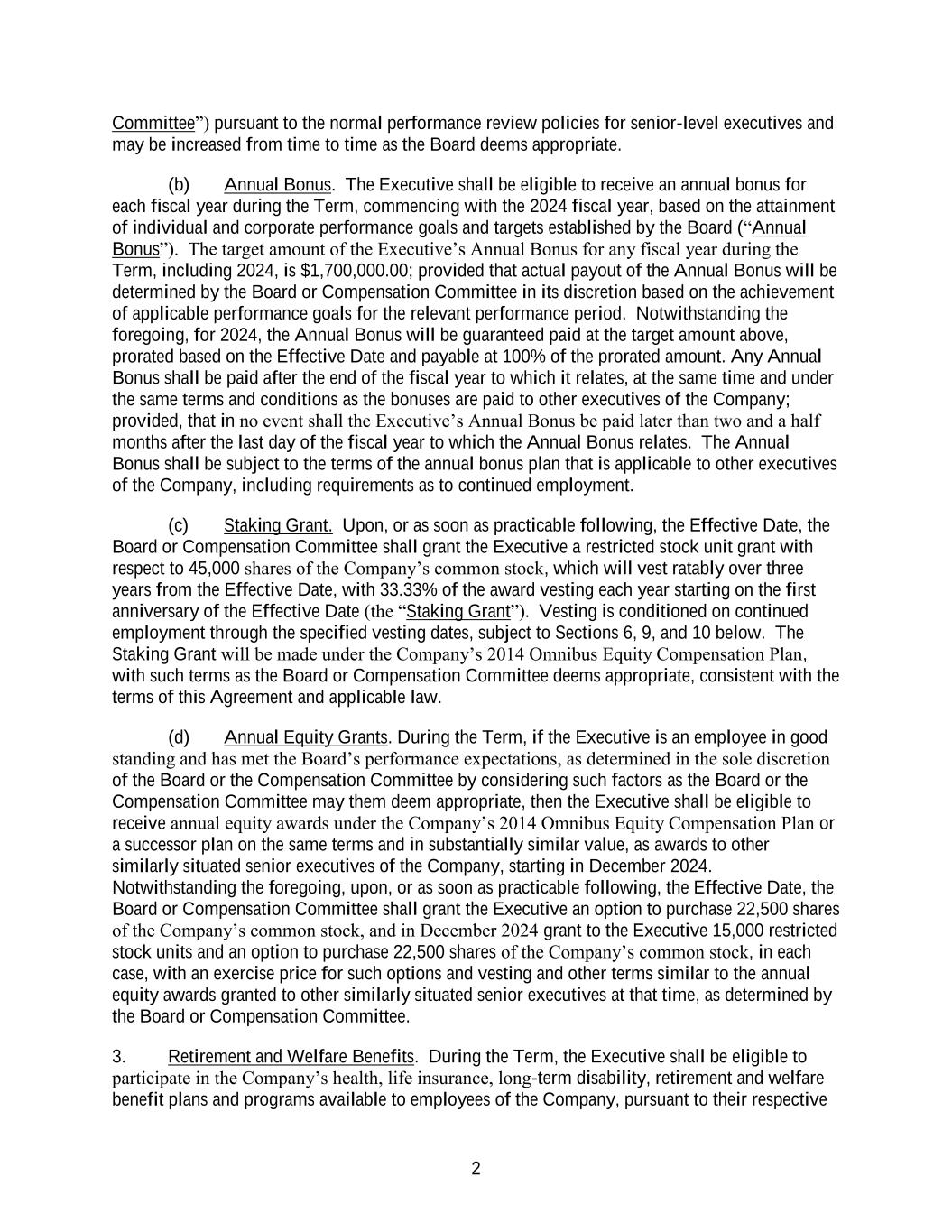 2 Committee”) pursuant to the normal performance review policies for senior-level executives and may be increased from time to time as the Board deems appropriate. (b) Annual Bonus. The Executive shall be eligible to receive an annual bonus for each fiscal year during the Term, commencing with the 2024 fiscal year, based on the attainment of individual and corporate performance goals and targets established by the Board (“Annual Bonus”). The target amount of the Executive’s Annual Bonus for any fiscal year during the Term, including 2024, is $1,700,000.00; provided that actual payout of the Annual Bonus will be determined by the Board or Compensation Committee in its discretion based on the achievement of applicable performance goals for the relevant performance period. Notwithstanding the foregoing, for 2024, the Annual Bonus will be guaranteed paid at the target amount above, prorated based on the Effective Date and payable at 100% of the prorated amount. Any Annual Bonus shall be paid after the end of the fiscal year to which it relates, at the same time and under the same terms and conditions as the bonuses are paid to other executives of the Company; provided, that in no event shall the Executive’s Annual Bonus be paid later than two and a half months after the last day of the fiscal year to which the Annual Bonus relates. The Annual Bonus shall be subject to the terms of the annual bonus plan that is applicable to other executives of the Company, including requirements as to continued employment. (c) Staking Grant. Upon, or as soon as practicable following, the Effective Date, the Board or Compensation Committee shall grant the Executive a restricted stock unit grant with respect to 45,000 shares of the Company’s common stock, which will vest ratably over three years from the Effective Date, with 33.33% of the award vesting each year starting on the first anniversary of the Effective Date (the “Staking Grant”). Vesting is conditioned on continued employment through the specified vesting dates, subject to Sections 6, 9, and 10 below. The Staking Grant will be made under the Company’s 2014 Omnibus Equity Compensation Plan, with such terms as the Board or Compensation Committee deems appropriate, consistent with the terms of this Agreement and applicable law. (d) Annual Equity Grants. During the Term, if the Executive is an employee in good standing and has met the Board’s performance expectations, as determined in the sole discretion of the Board or the Compensation Committee by considering such factors as the Board or the Compensation Committee may them deem appropriate, then the Executive shall be eligible to receive annual equity awards under the Company’s 2014 Omnibus Equity Compensation Plan or a successor plan on the same terms and in substantially similar value, as awards to other similarly situated senior executives of the Company, starting in December 2024. Notwithstanding the foregoing, upon, or as soon as practicable following, the Effective Date, the Board or Compensation Committee shall grant the Executive an option to purchase 22,500 shares of the Company’s common stock, and in December 2024 grant to the Executive 15,000 restricted stock units and an option to purchase 22,500 shares of the Company’s common stock, in each case, with an exercise price for such options and vesting and other terms similar to the annual equity awards granted to other similarly situated senior executives at that time, as determined by the Board or Compensation Committee. 3. Retirement and Welfare Benefits. During the Term, the Executive shall be eligible to participate in the Company’s health, life insurance, long-term disability, retirement and welfare benefit plans and programs available to employees of the Company, pursuant to their respective