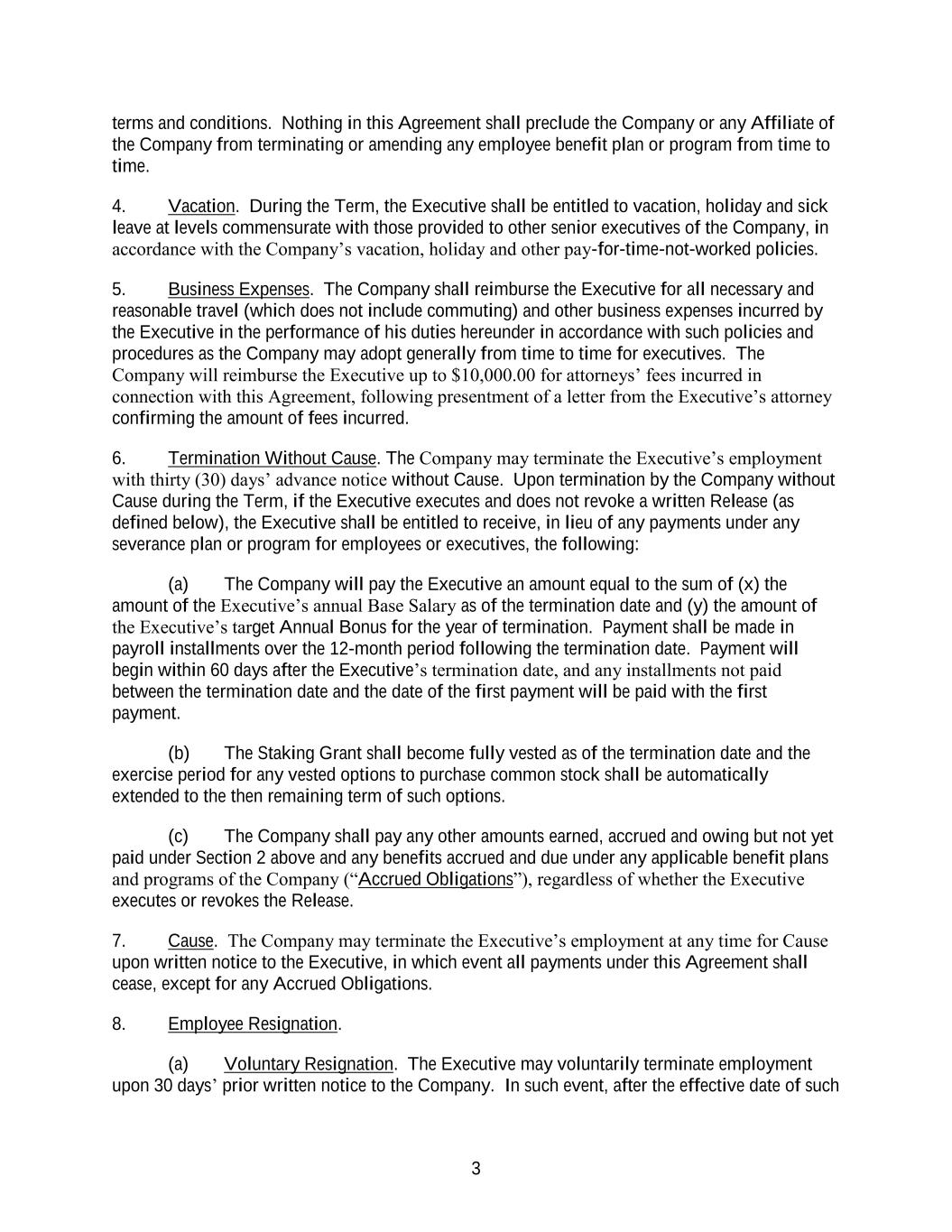 3 terms and conditions. Nothing in this Agreement shall preclude the Company or any Affiliate of the Company from terminating or amending any employee benefit plan or program from time to time. 4. Vacation. During the Term, the Executive shall be entitled to vacation, holiday and sick leave at levels commensurate with those provided to other senior executives of the Company, in accordance with the Company’s vacation, holiday and other pay-for-time-not-worked policies. 5. Business Expenses. The Company shall reimburse the Executive for all necessary and reasonable travel (which does not include commuting) and other business expenses incurred by the Executive in the performance of his duties hereunder in accordance with such policies and procedures as the Company may adopt generally from time to time for executives. The Company will reimburse the Executive up to $10,000.00 for attorneys’ fees incurred in connection with this Agreement, following presentment of a letter from the Executive’s attorney confirming the amount of fees incurred. 6. Termination Without Cause. The Company may terminate the Executive’s employment with thirty (30) days’ advance notice without Cause. Upon termination by the Company without Cause during the Term, if the Executive executes and does not revoke a written Release (as defined below), the Executive shall be entitled to receive, in lieu of any payments under any severance plan or program for employees or executives, the following: (a) The Company will pay the Executive an amount equal to the sum of (x) the amount of the Executive’s annual Base Salary as of the termination date and (y) the amount of the Executive’s target Annual Bonus for the year of termination. Payment shall be made in payroll installments over the 12-month period following the termination date. Payment will begin within 60 days after the Executive’s termination date, and any installments not paid between the termination date and the date of the first payment will be paid with the first payment. (b) The Staking Grant shall become fully vested as of the termination date and the exercise period for any vested options to purchase common stock shall be automatically extended to the then remaining term of such options. (c) The Company shall pay any other amounts earned, accrued and owing but not yet paid under Section 2 above and any benefits accrued and due under any applicable benefit plans and programs of the Company (“Accrued Obligations”), regardless of whether the Executive executes or revokes the Release. 7. Cause. The Company may terminate the Executive’s employment at any time for Cause upon written notice to the Executive, in which event all payments under this Agreement shall cease, except for any Accrued Obligations. 8. Employee Resignation. (a) Voluntary Resignation. The Executive may voluntarily terminate employment upon 30 days’ prior written notice to the Company. In such event, after the effective date of such