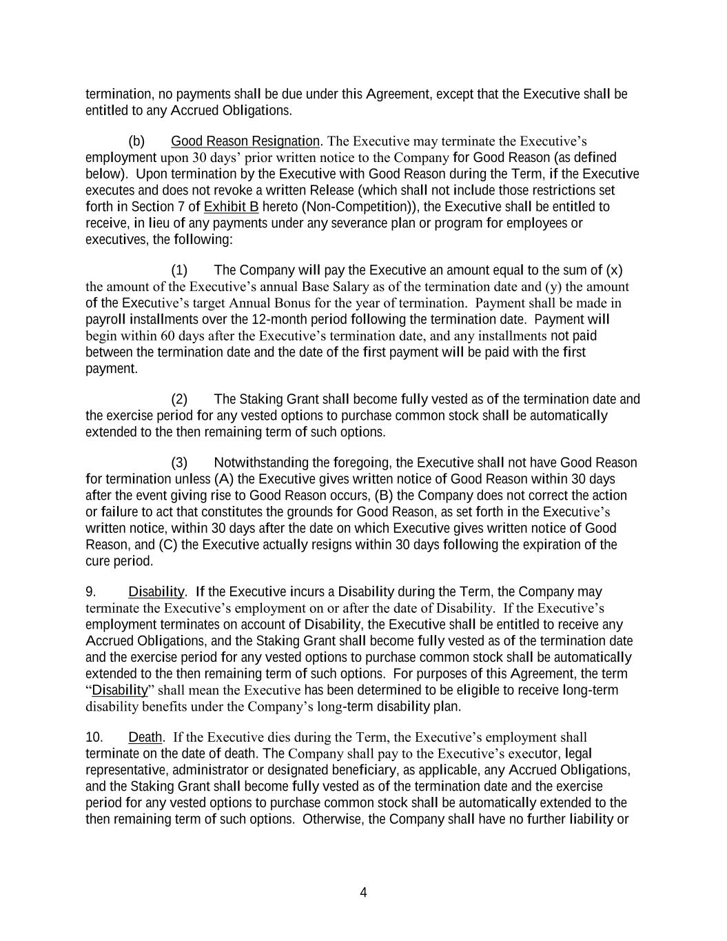 4 termination, no payments shall be due under this Agreement, except that the Executive shall be entitled to any Accrued Obligations. (b) Good Reason Resignation. The Executive may terminate the Executive’s employment upon 30 days’ prior written notice to the Company for Good Reason (as defined below). Upon termination by the Executive with Good Reason during the Term, if the Executive executes and does not revoke a written Release (which shall not include those restrictions set forth in Section 7 of Exhibit B hereto (Non-Competition)), the Executive shall be entitled to receive, in lieu of any payments under any severance plan or program for employees or executives, the following: (1) The Company will pay the Executive an amount equal to the sum of (x) the amount of the Executive’s annual Base Salary as of the termination date and (y) the amount of the Executive’s target Annual Bonus for the year of termination. Payment shall be made in payroll installments over the 12-month period following the termination date. Payment will begin within 60 days after the Executive’s termination date, and any installments not paid between the termination date and the date of the first payment will be paid with the first payment. (2) The Staking Grant shall become fully vested as of the termination date and the exercise period for any vested options to purchase common stock shall be automatically extended to the then remaining term of such options. (3) Notwithstanding the foregoing, the Executive shall not have Good Reason for termination unless (A) the Executive gives written notice of Good Reason within 30 days after the event giving rise to Good Reason occurs, (B) the Company does not correct the action or failure to act that constitutes the grounds for Good Reason, as set forth in the Executive’s written notice, within 30 days after the date on which Executive gives written notice of Good Reason, and (C) the Executive actually resigns within 30 days following the expiration of the cure period. 9. Disability. If the Executive incurs a Disability during the Term, the Company may terminate the Executive’s employment on or after the date of Disability. If the Executive’s employment terminates on account of Disability, the Executive shall be entitled to receive any Accrued Obligations, and the Staking Grant shall become fully vested as of the termination date and the exercise period for any vested options to purchase common stock shall be automatically extended to the then remaining term of such options. For purposes of this Agreement, the term “Disability” shall mean the Executive has been determined to be eligible to receive long-term disability benefits under the Company’s long-term disability plan. 10. Death. If the Executive dies during the Term, the Executive’s employment shall terminate on the date of death. The Company shall pay to the Executive’s executor, legal representative, administrator or designated beneficiary, as applicable, any Accrued Obligations, and the Staking Grant shall become fully vested as of the termination date and the exercise period for any vested options to purchase common stock shall be automatically extended to the then remaining term of such options. Otherwise, the Company shall have no further liability or
