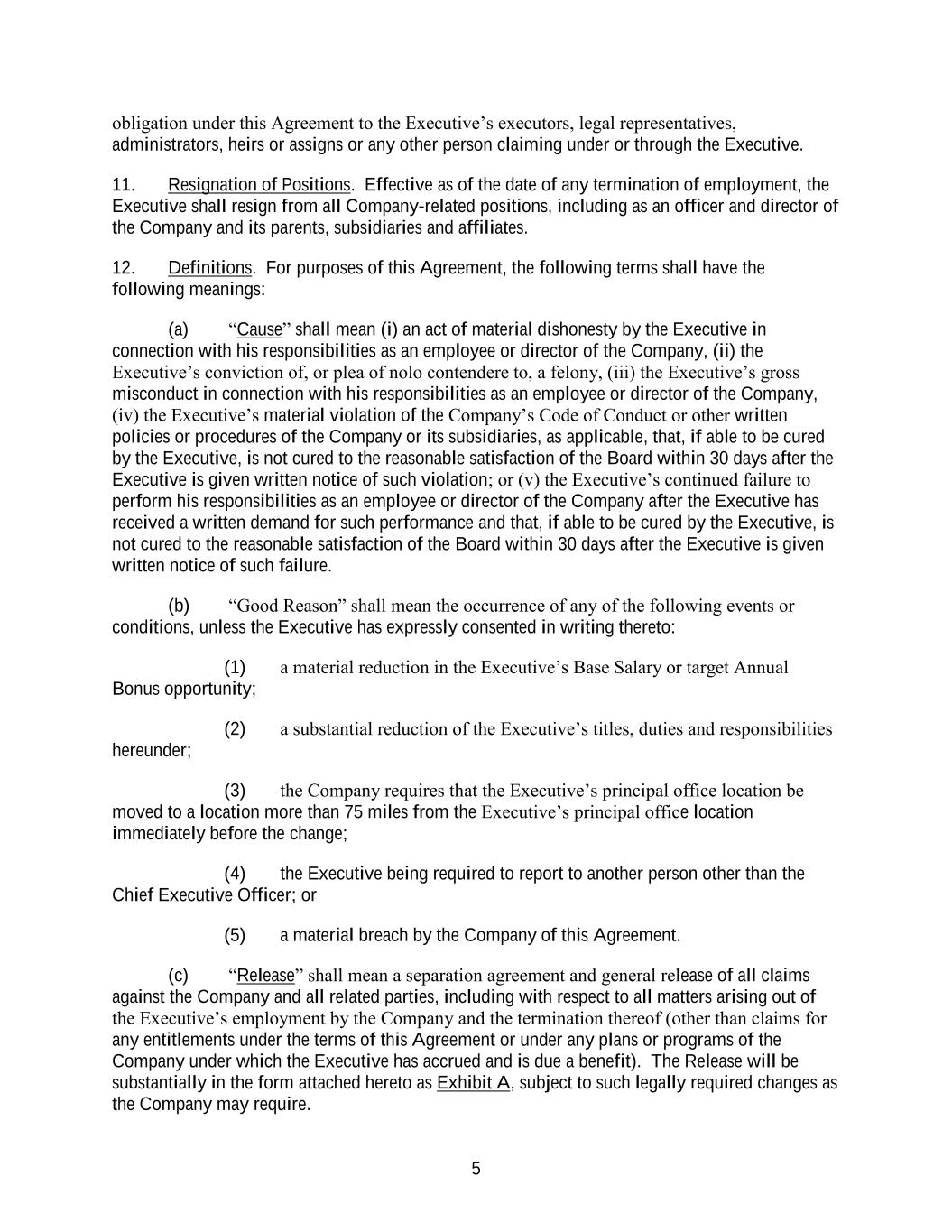 5 obligation under this Agreement to the Executive’s executors, legal representatives, administrators, heirs or assigns or any other person claiming under or through the Executive. 11. Resignation of Positions. Effective as of the date of any termination of employment, the Executive shall resign from all Company-related positions, including as an officer and director of the Company and its parents, subsidiaries and affiliates. 12. Definitions. For purposes of this Agreement, the following terms shall have the following meanings: (a) “Cause” shall mean (i) an act of material dishonesty by the Executive in connection with his responsibilities as an employee or director of the Company, (ii) the Executive’s conviction of, or plea of nolo contendere to, a felony, (iii) the Executive’s gross misconduct in connection with his responsibilities as an employee or director of the Company, (iv) the Executive’s material violation of the Company’s Code of Conduct or other written policies or procedures of the Company or its subsidiaries, as applicable, that, if able to be cured by the Executive, is not cured to the reasonable satisfaction of the Board within 30 days after the Executive is given written notice of such violation; or (v) the Executive’s continued failure to perform his responsibilities as an employee or director of the Company after the Executive has received a written demand for such performance and that, if able to be cured by the Executive, is not cured to the reasonable satisfaction of the Board within 30 days after the Executive is given written notice of such failure. (b) “Good Reason” shall mean the occurrence of any of the following events or conditions, unless the Executive has expressly consented in writing thereto: (1) a material reduction in the Executive’s Base Salary or target Annual Bonus opportunity; (2) a substantial reduction of the Executive’s titles, duties and responsibilities hereunder; (3) the Company requires that the Executive’s principal office location be moved to a location more than 75 miles from the Executive’s principal office location immediately before the change; (4) the Executive being required to report to another person other than the Chief Executive Officer; or (5) a material breach by the Company of this Agreement. (c) “Release” shall mean a separation agreement and general release of all claims against the Company and all related parties, including with respect to all matters arising out of the Executive’s employment by the Company and the termination thereof (other than claims for any entitlements under the terms of this Agreement or under any plans or programs of the Company under which the Executive has accrued and is due a benefit). The Release will be substantially in the form attached hereto as Exhibit A, subject to such legally required changes as the Company may require.
