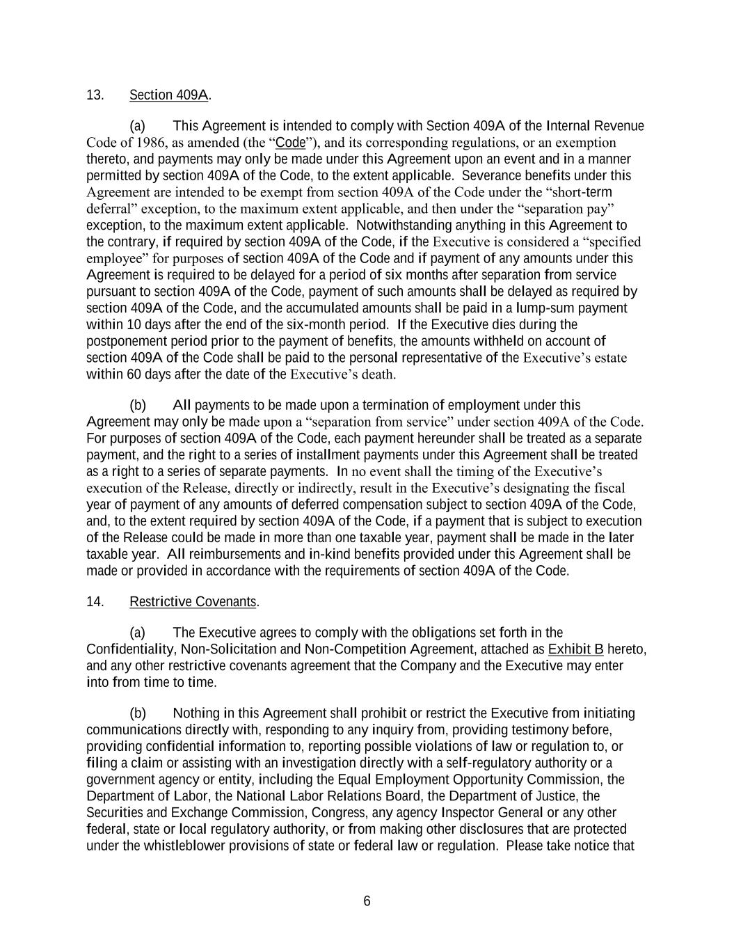 6 13. Section 409A. (a) This Agreement is intended to comply with Section 409A of the Internal Revenue Code of 1986, as amended (the “Code”), and its corresponding regulations, or an exemption thereto, and payments may only be made under this Agreement upon an event and in a manner permitted by section 409A of the Code, to the extent applicable. Severance benefits under this Agreement are intended to be exempt from section 409A of the Code under the “short-term deferral” exception, to the maximum extent applicable, and then under the “separation pay” exception, to the maximum extent applicable. Notwithstanding anything in this Agreement to the contrary, if required by section 409A of the Code, if the Executive is considered a “specified employee” for purposes of section 409A of the Code and if payment of any amounts under this Agreement is required to be delayed for a period of six months after separation from service pursuant to section 409A of the Code, payment of such amounts shall be delayed as required by section 409A of the Code, and the accumulated amounts shall be paid in a lump-sum payment within 10 days after the end of the six-month period. If the Executive dies during the postponement period prior to the payment of benefits, the amounts withheld on account of section 409A of the Code shall be paid to the personal representative of the Executive’s estate within 60 days after the date of the Executive’s death. (b) All payments to be made upon a termination of employment under this Agreement may only be made upon a “separation from service” under section 409A of the Code. For purposes of section 409A of the Code, each payment hereunder shall be treated as a separate payment, and the right to a series of installment payments under this Agreement shall be treated as a right to a series of separate payments. In no event shall the timing of the Executive’s execution of the Release, directly or indirectly, result in the Executive’s designating the fiscal year of payment of any amounts of deferred compensation subject to section 409A of the Code, and, to the extent required by section 409A of the Code, if a payment that is subject to execution of the Release could be made in more than one taxable year, payment shall be made in the later taxable year. All reimbursements and in-kind benefits provided under this Agreement shall be made or provided in accordance with the requirements of section 409A of the Code. 14. Restrictive Covenants. (a) The Executive agrees to comply with the obligations set forth in the Confidentiality, Non-Solicitation and Non-Competition Agreement, attached as Exhibit B hereto, and any other restrictive covenants agreement that the Company and the Executive may enter into from time to time. (b) Nothing in this Agreement shall prohibit or restrict the Executive from initiating communications directly with, responding to any inquiry from, providing testimony before, providing confidential information to, reporting possible violations of law or regulation to, or filing a claim or assisting with an investigation directly with a self-regulatory authority or a government agency or entity, including the Equal Employment Opportunity Commission, the Department of Labor, the National Labor Relations Board, the Department of Justice, the Securities and Exchange Commission, Congress, any agency Inspector General or any other federal, state or local regulatory authority, or from making other disclosures that are protected under the whistleblower provisions of state or federal law or regulation. Please take notice that