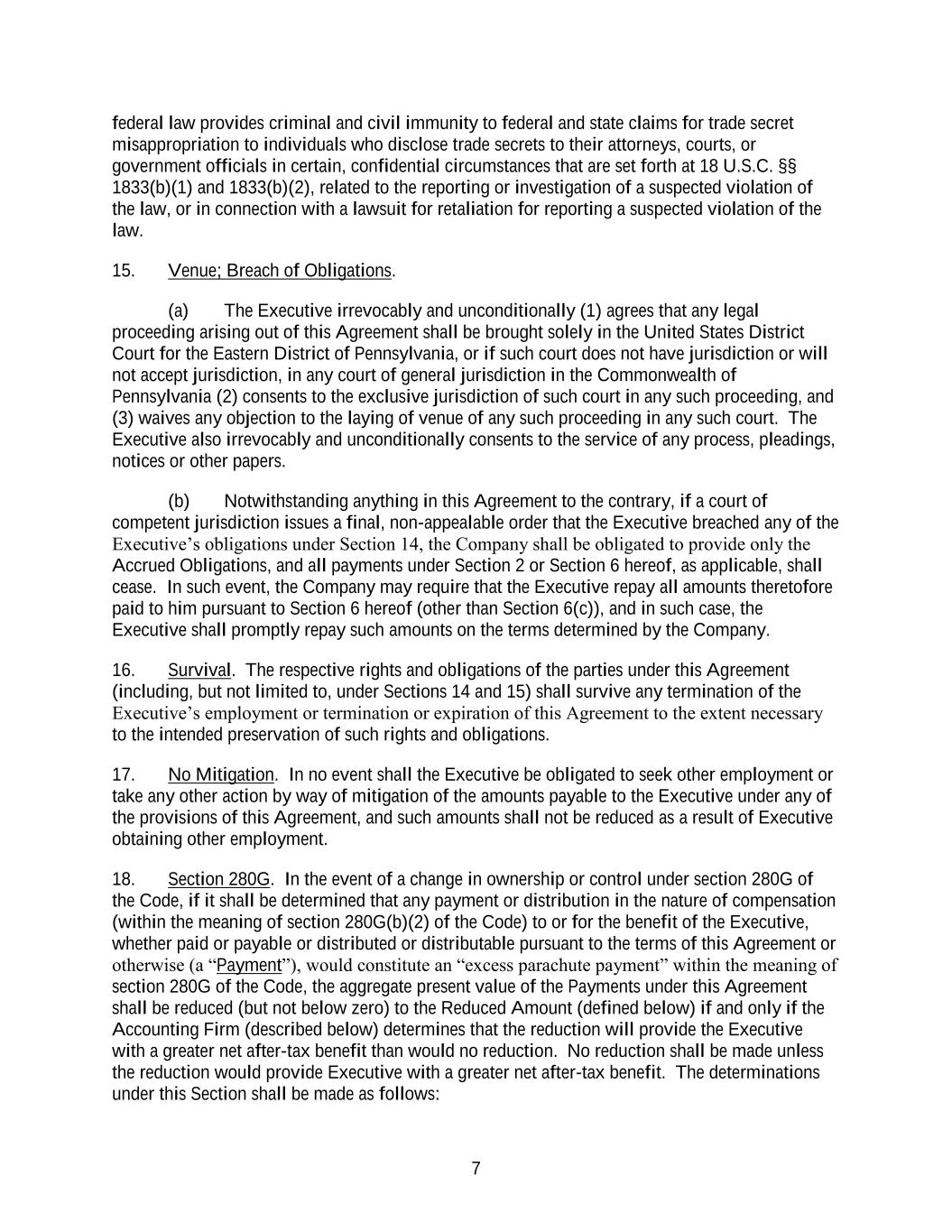 7 federal law provides criminal and civil immunity to federal and state claims for trade secret misappropriation to individuals who disclose trade secrets to their attorneys, courts, or government officials in certain, confidential circumstances that are set forth at 18 U.S.C. §§ 1833(b)(1) and 1833(b)(2), related to the reporting or investigation of a suspected violation of the law, or in connection with a lawsuit for retaliation for reporting a suspected violation of the law. 15. Venue; Breach of Obligations. (a) The Executive irrevocably and unconditionally (1) agrees that any legal proceeding arising out of this Agreement shall be brought solely in the United States District Court for the Eastern District of Pennsylvania, or if such court does not have jurisdiction or will not accept jurisdiction, in any court of general jurisdiction in the Commonwealth of Pennsylvania (2) consents to the exclusive jurisdiction of such court in any such proceeding, and (3) waives any objection to the laying of venue of any such proceeding in any such court. The Executive also irrevocably and unconditionally consents to the service of any process, pleadings, notices or other papers. (b) Notwithstanding anything in this Agreement to the contrary, if a court of competent jurisdiction issues a final, non-appealable order that the Executive breached any of the Executive’s obligations under Section 14, the Company shall be obligated to provide only the Accrued Obligations, and all payments under Section 2 or Section 6 hereof, as applicable, shall cease. In such event, the Company may require that the Executive repay all amounts theretofore paid to him pursuant to Section 6 hereof (other than Section 6(c)), and in such case, the Executive shall promptly repay such amounts on the terms determined by the Company. 16. Survival. The respective rights and obligations of the parties under this Agreement (including, but not limited to, under Sections 14 and 15) shall survive any termination of the Executive’s employment or termination or expiration of this Agreement to the extent necessary to the intended preservation of such rights and obligations. 17. No Mitigation. In no event shall the Executive be obligated to seek other employment or take any other action by way of mitigation of the amounts payable to the Executive under any of the provisions of this Agreement, and such amounts shall not be reduced as a result of Executive obtaining other employment. 18. Section 280G. In the event of a change in ownership or control under section 280G of the Code, if it shall be determined that any payment or distribution in the nature of compensation (within the meaning of section 280G(b)(2) of the Code) to or for the benefit of the Executive, whether paid or payable or distributed or distributable pursuant to the terms of this Agreement or otherwise (a “Payment”), would constitute an “excess parachute payment” within the meaning of section 280G of the Code, the aggregate present value of the Payments under this Agreement shall be reduced (but not below zero) to the Reduced Amount (defined below) if and only if the Accounting Firm (described below) determines that the reduction will provide the Executive with a greater net after-tax benefit than would no reduction. No reduction shall be made unless the reduction would provide Executive with a greater net after-tax benefit. The determinations under this Section shall be made as follows: