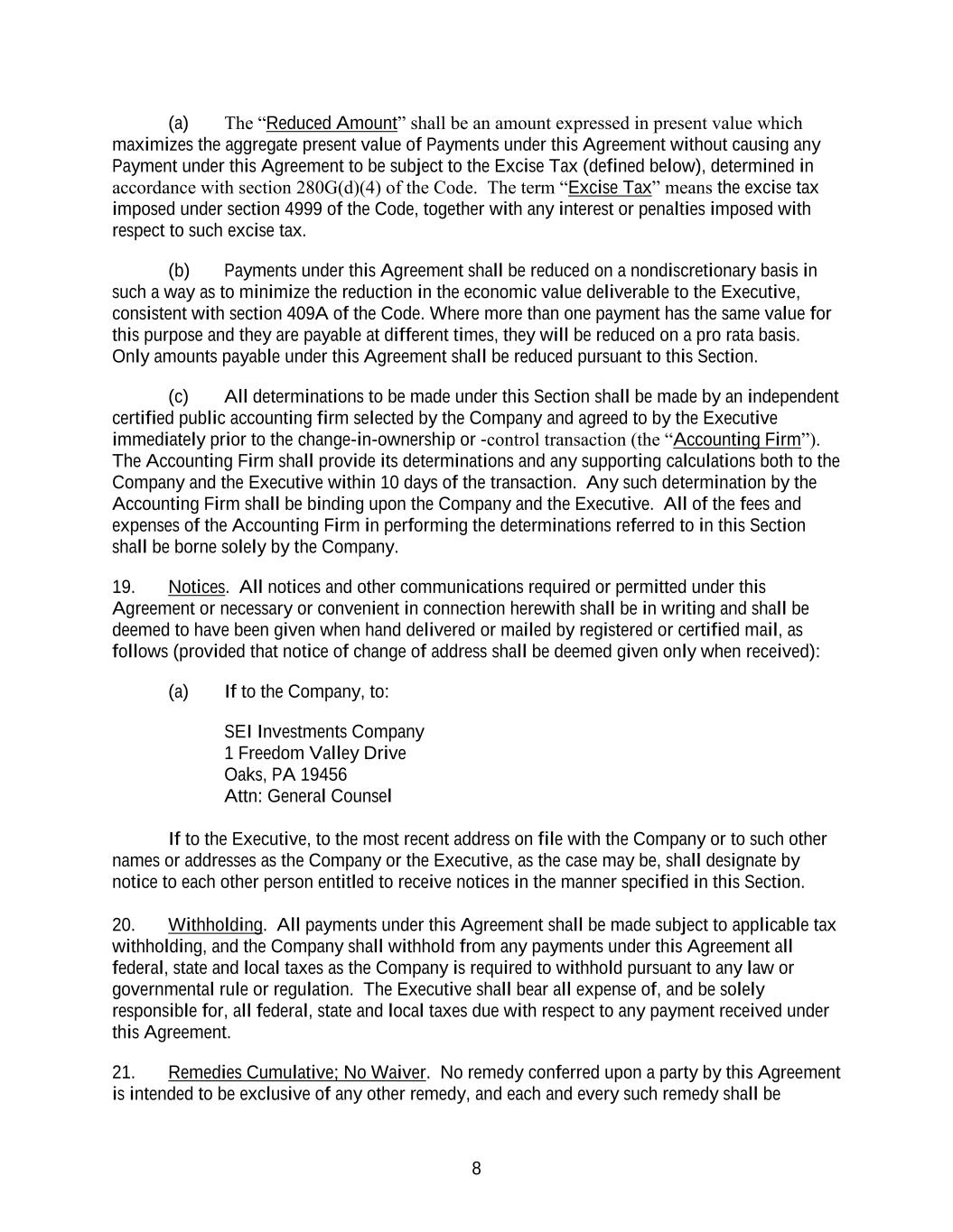 8 (a) The “Reduced Amount” shall be an amount expressed in present value which maximizes the aggregate present value of Payments under this Agreement without causing any Payment under this Agreement to be subject to the Excise Tax (defined below), determined in accordance with section 280G(d)(4) of the Code. The term “Excise Tax” means the excise tax imposed under section 4999 of the Code, together with any interest or penalties imposed with respect to such excise tax. (b) Payments under this Agreement shall be reduced on a nondiscretionary basis in such a way as to minimize the reduction in the economic value deliverable to the Executive, consistent with section 409A of the Code. Where more than one payment has the same value for this purpose and they are payable at different times, they will be reduced on a pro rata basis. Only amounts payable under this Agreement shall be reduced pursuant to this Section. (c) All determinations to be made under this Section shall be made by an independent certified public accounting firm selected by the Company and agreed to by the Executive immediately prior to the change-in-ownership or -control transaction (the “Accounting Firm”). The Accounting Firm shall provide its determinations and any supporting calculations both to the Company and the Executive within 10 days of the transaction. Any such determination by the Accounting Firm shall be binding upon the Company and the Executive. All of the fees and expenses of the Accounting Firm in performing the determinations referred to in this Section shall be borne solely by the Company. 19. Notices. All notices and other communications required or permitted under this Agreement or necessary or convenient in connection herewith shall be in writing and shall be deemed to have been given when hand delivered or mailed by registered or certified mail, as follows (provided that notice of change of address shall be deemed given only when received): (a) If to the Company, to: SEI Investments Company 1 Freedom Valley Drive Oaks, PA 19456 Attn: General Counsel If to the Executive, to the most recent address on file with the Company or to such other names or addresses as the Company or the Executive, as the case may be, shall designate by notice to each other person entitled to receive notices in the manner specified in this Section. 20. Withholding. All payments under this Agreement shall be made subject to applicable tax withholding, and the Company shall withhold from any payments under this Agreement all federal, state and local taxes as the Company is required to withhold pursuant to any law or governmental rule or regulation. The Executive shall bear all expense of, and be solely responsible for, all federal, state and local taxes due with respect to any payment received under this Agreement. 21. Remedies Cumulative; No Waiver. No remedy conferred upon a party by this Agreement is intended to be exclusive of any other remedy, and each and every such remedy shall be