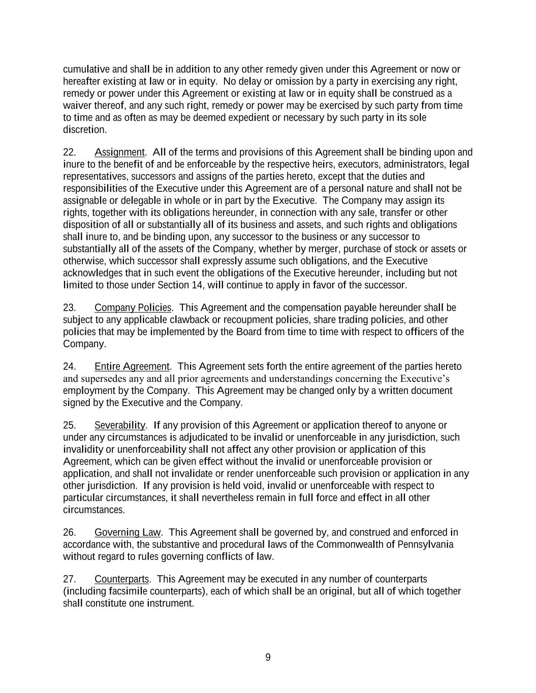 9 cumulative and shall be in addition to any other remedy given under this Agreement or now or hereafter existing at law or in equity. No delay or omission by a party in exercising any right, remedy or power under this Agreement or existing at law or in equity shall be construed as a waiver thereof, and any such right, remedy or power may be exercised by such party from time to time and as often as may be deemed expedient or necessary by such party in its sole discretion. 22. Assignment. All of the terms and provisions of this Agreement shall be binding upon and inure to the benefit of and be enforceable by the respective heirs, executors, administrators, legal representatives, successors and assigns of the parties hereto, except that the duties and responsibilities of the Executive under this Agreement are of a personal nature and shall not be assignable or delegable in whole or in part by the Executive. The Company may assign its rights, together with its obligations hereunder, in connection with any sale, transfer or other disposition of all or substantially all of its business and assets, and such rights and obligations shall inure to, and be binding upon, any successor to the business or any successor to substantially all of the assets of the Company, whether by merger, purchase of stock or assets or otherwise, which successor shall expressly assume such obligations, and the Executive acknowledges that in such event the obligations of the Executive hereunder, including but not limited to those under Section 14, will continue to apply in favor of the successor. 23. Company Policies. This Agreement and the compensation payable hereunder shall be subject to any applicable clawback or recoupment policies, share trading policies, and other policies that may be implemented by the Board from time to time with respect to officers of the Company. 24. Entire Agreement. This Agreement sets forth the entire agreement of the parties hereto and supersedes any and all prior agreements and understandings concerning the Executive’s employment by the Company. This Agreement may be changed only by a written document signed by the Executive and the Company. 25. Severability. If any provision of this Agreement or application thereof to anyone or under any circumstances is adjudicated to be invalid or unenforceable in any jurisdiction, such invalidity or unenforceability shall not affect any other provision or application of this Agreement, which can be given effect without the invalid or unenforceable provision or application, and shall not invalidate or render unenforceable such provision or application in any other jurisdiction. If any provision is held void, invalid or unenforceable with respect to particular circumstances, it shall nevertheless remain in full force and effect in all other circumstances. 26. Governing Law. This Agreement shall be governed by, and construed and enforced in accordance with, the substantive and procedural laws of the Commonwealth of Pennsylvania without regard to rules governing conflicts of law. 27. Counterparts. This Agreement may be executed in any number of counterparts (including facsimile counterparts), each of which shall be an original, but all of which together shall constitute one instrument.