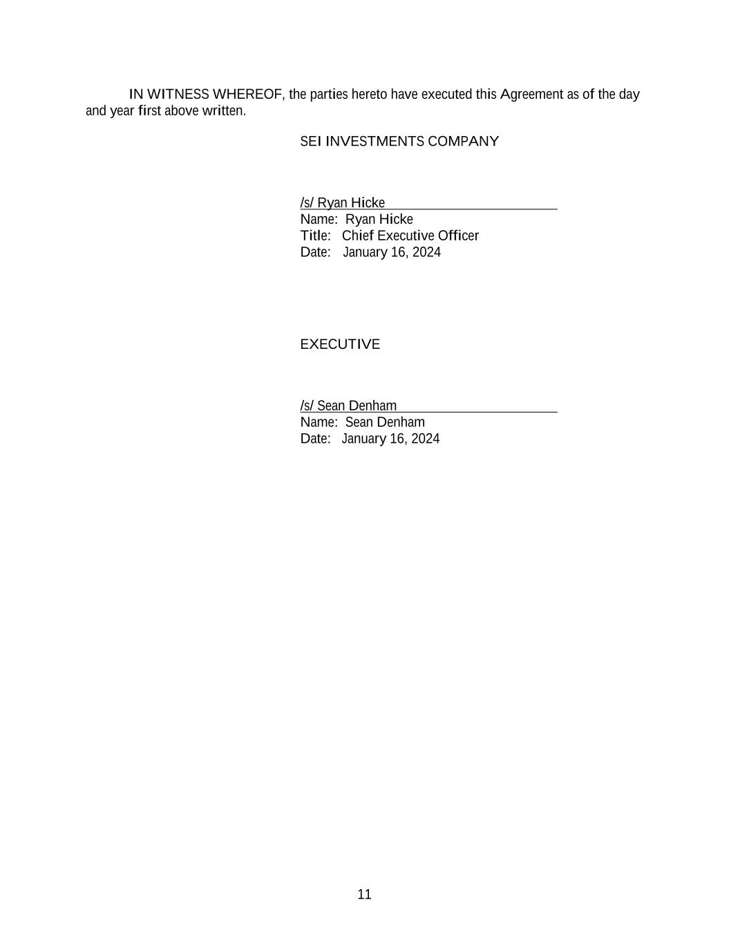 11 IN WITNESS WHEREOF, the parties hereto have executed this Agreement as of the day and year first above written. SEI INVESTMENTS COMPANY /s/ Ryan Hicke Name: Ryan Hicke Title: Chief Executive Officer Date: January 16, 2024 EXECUTIVE /s/ Sean Denham Name: Sean Denham Date: January 16, 2024