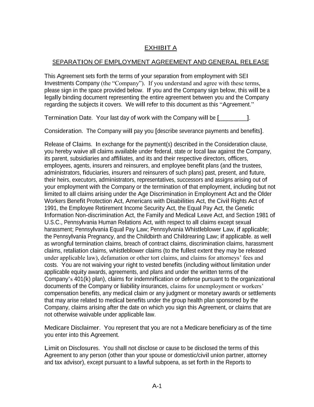 A-1 EXHIBIT A SEPARATION OF EMPLOYMENT AGREEMENT AND GENERAL RELEASE This Agreement sets forth the terms of your separation from employment with SEI Investments Company (the “Company”). If you understand and agree with these terms, please sign in the space provided below. If you and the Company sign below, this will be a legally binding document representing the entire agreement between you and the Company regarding the subjects it covers. We will refer to this document as this “Agreement.” Termination Date. Your last day of work with the Company will be [_________]. Consideration. The Company will pay you [describe severance payments and benefits]. Release of Claims. In exchange for the payment(s) described in the Consideration clause, you hereby waive all claims available under federal, state or local law against the Company, its parent, subsidiaries and affiliates, and its and their respective directors, officers, employees, agents, insurers and reinsurers, and employee benefit plans (and the trustees, administrators, fiduciaries, insurers and reinsurers of such plans) past, present, and future, their heirs, executors, administrators, representatives, successors and assigns arising out of your employment with the Company or the termination of that employment, including but not limited to all claims arising under the Age Discrimination in Employment Act and the Older Workers Benefit Protection Act, Americans with Disabilities Act, the Civil Rights Act of 1991, the Employee Retirement Income Security Act, the Equal Pay Act, the Genetic Information Non-discrimination Act, the Family and Medical Leave Act, and Section 1981 of U.S.C., Pennsylvania Human Relations Act, with respect to all claims except sexual harassment; Pennsylvania Equal Pay Law; Pennsylvania Whistleblower Law, if applicable; the Pennsylvania Pregnancy, and the Childbirth and Childrearing Law; if applicable. as well as wrongful termination claims, breach of contract claims, discrimination claims, harassment claims, retaliation claims, whistleblower claims (to the fullest extent they may be released under applicable law), defamation or other tort claims, and claims for attorneys’ fees and costs. You are not waiving your right to vested benefits (including without limitation under applicable equity awards, agreements, and plans and under the written terms of the Company’s 401(k) plan), claims for indemnification or defense pursuant to the organizational documents of the Company or liability insurances, claims for unemployment or workers’ compensation benefits, any medical claim or any judgment or monetary awards or settlements that may arise related to medical benefits under the group health plan sponsored by the Company, claims arising after the date on which you sign this Agreement, or claims that are not otherwise waivable under applicable law. Medicare Disclaimer. You represent that you are not a Medicare beneficiary as of the time you enter into this Agreement. Limit on Disclosures. You shall not disclose or cause to be disclosed the terms of this Agreement to any person (other than your spouse or domestic/civil union partner, attorney and tax advisor), except pursuant to a lawful subpoena, as set forth in the Reports to