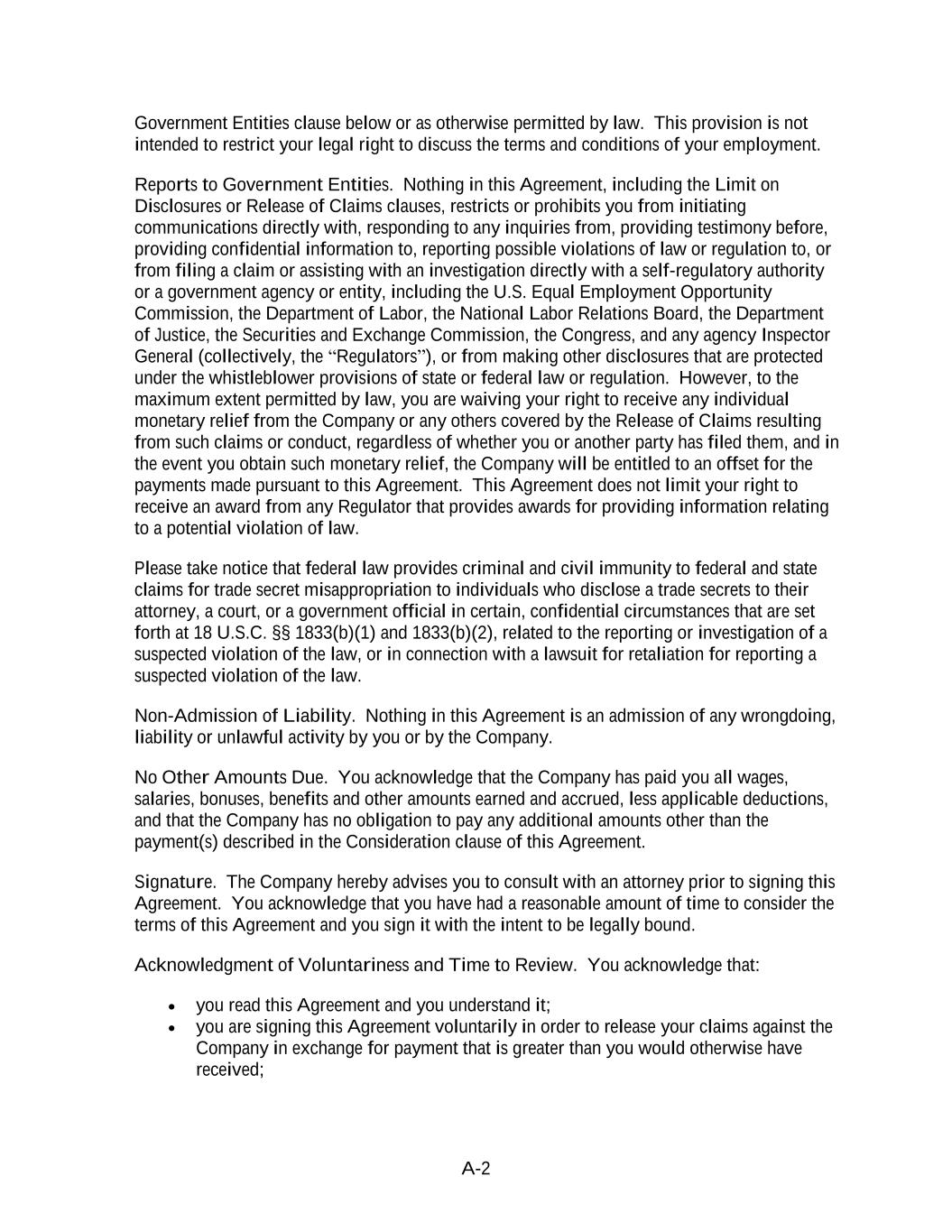 A-2 Government Entities clause below or as otherwise permitted by law. This provision is not intended to restrict your legal right to discuss the terms and conditions of your employment. Reports to Government Entities. Nothing in this Agreement, including the Limit on Disclosures or Release of Claims clauses, restricts or prohibits you from initiating communications directly with, responding to any inquiries from, providing testimony before, providing confidential information to, reporting possible violations of law or regulation to, or from filing a claim or assisting with an investigation directly with a self-regulatory authority or a government agency or entity, including the U.S. Equal Employment Opportunity Commission, the Department of Labor, the National Labor Relations Board, the Department of Justice, the Securities and Exchange Commission, the Congress, and any agency Inspector General (collectively, the “Regulators”), or from making other disclosures that are protected under the whistleblower provisions of state or federal law or regulation. However, to the maximum extent permitted by law, you are waiving your right to receive any individual monetary relief from the Company or any others covered by the Release of Claims resulting from such claims or conduct, regardless of whether you or another party has filed them, and in the event you obtain such monetary relief, the Company will be entitled to an offset for the payments made pursuant to this Agreement. This Agreement does not limit your right to receive an award from any Regulator that provides awards for providing information relating to a potential violation of law. Please take notice that federal law provides criminal and civil immunity to federal and state claims for trade secret misappropriation to individuals who disclose a trade secrets to their attorney, a court, or a government official in certain, confidential circumstances that are set forth at 18 U.S.C. §§ 1833(b)(1) and 1833(b)(2), related to the reporting or investigation of a suspected violation of the law, or in connection with a lawsuit for retaliation for reporting a suspected violation of the law. Non-Admission of Liability. Nothing in this Agreement is an admission of any wrongdoing, liability or unlawful activity by you or by the Company. No Other Amounts Due. You acknowledge that the Company has paid you all wages, salaries, bonuses, benefits and other amounts earned and accrued, less applicable deductions, and that the Company has no obligation to pay any additional amounts other than the payment(s) described in the Consideration clause of this Agreement. Signature. The Company hereby advises you to consult with an attorney prior to signing this Agreement. You acknowledge that you have had a reasonable amount of time to consider the terms of this Agreement and you sign it with the intent to be legally bound. Acknowledgment of Voluntariness and Time to Review. You acknowledge that:  you read this Agreement and you understand it;  you are signing this Agreement voluntarily in order to release your claims against the Company in exchange for payment that is greater than you would otherwise have received;