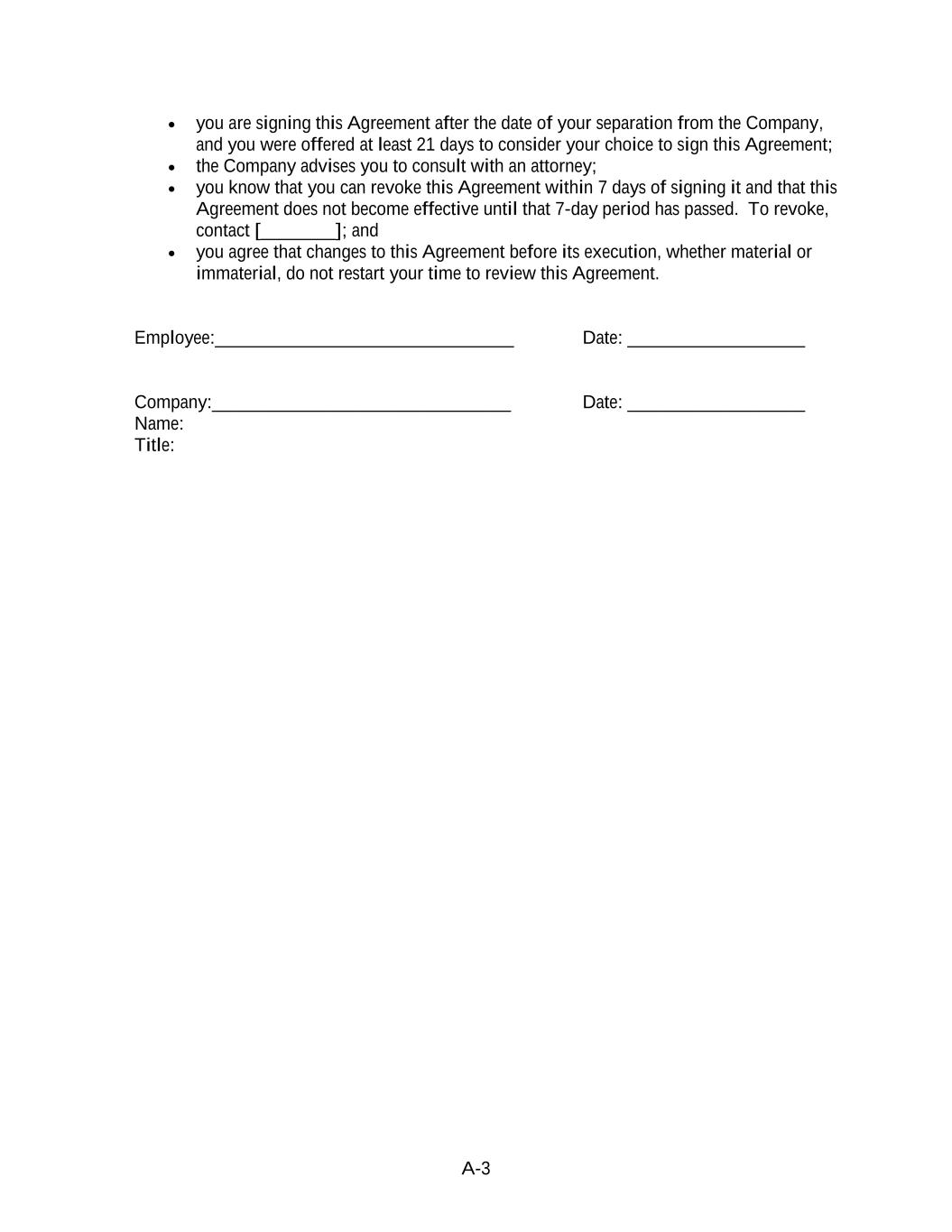 A-3  you are signing this Agreement after the date of your separation from the Company, and you were offered at least 21 days to consider your choice to sign this Agreement;  the Company advises you to consult with an attorney;  you know that you can revoke this Agreement within 7 days of signing it and that this Agreement does not become effective until that 7-day period has passed. To revoke, contact [________]; and  you agree that changes to this Agreement before its execution, whether material or immaterial, do not restart your time to review this Agreement. Employee:________________________________ Date: ___________________ Company:________________________________ Date: ___________________ Name: Title:
