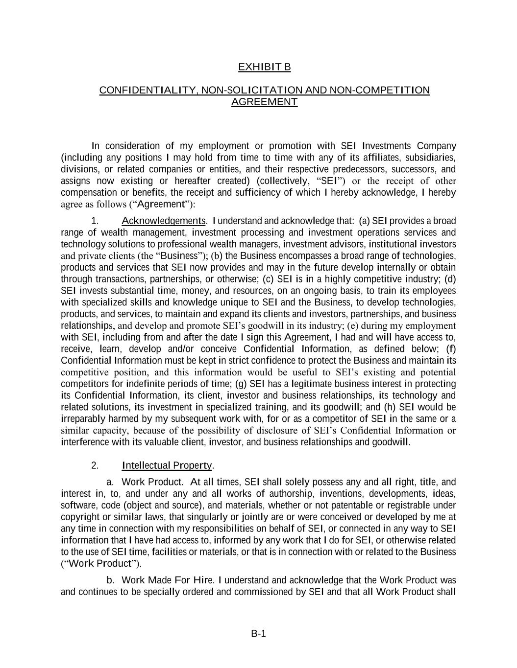 B-1 EXHIBIT B CONFIDENTIALITY, NON-SOLICITATION AND NON-COMPETITION AGREEMENT In consideration of my employment or promotion with SEI Investments Company (including any positions I may hold from time to time with any of its affiliates, subsidiaries, divisions, or related companies or entities, and their respective predecessors, successors, and assigns now existing or hereafter created) (collectively, “SEI”) or the receipt of other compensation or benefits, the receipt and sufficiency of which I hereby acknowledge, I hereby agree as follows (“Agreement”): 1. Acknowledgements. I understand and acknowledge that: (a) SEI provides a broad range of wealth management, investment processing and investment operations services and technology solutions to professional wealth managers, investment advisors, institutional investors and private clients (the “Business”); (b) the Business encompasses a broad range of technologies, products and services that SEI now provides and may in the future develop internally or obtain through transactions, partnerships, or otherwise; (c) SEI is in a highly competitive industry; (d) SEI invests substantial time, money, and resources, on an ongoing basis, to train its employees with specialized skills and knowledge unique to SEI and the Business, to develop technologies, products, and services, to maintain and expand its clients and investors, partnerships, and business relationships, and develop and promote SEI’s goodwill in its industry; (e) during my employment with SEI, including from and after the date I sign this Agreement, I had and will have access to, receive, learn, develop and/or conceive Confidential Information, as defined below; (f) Confidential Information must be kept in strict confidence to protect the Business and maintain its competitive position, and this information would be useful to SEI’s existing and potential competitors for indefinite periods of time; (g) SEI has a legitimate business interest in protecting its Confidential Information, its client, investor and business relationships, its technology and related solutions, its investment in specialized training, and its goodwill; and (h) SEI would be irreparably harmed by my subsequent work with, for or as a competitor of SEI in the same or a similar capacity, because of the possibility of disclosure of SEI’s Confidential Information or interference with its valuable client, investor, and business relationships and goodwill. 2. Intellectual Property. a. Work Product. At all times, SEI shall solely possess any and all right, title, and interest in, to, and under any and all works of authorship, inventions, developments, ideas, software, code (object and source), and materials, whether or not patentable or registrable under copyright or similar laws, that singularly or jointly are or were conceived or developed by me at any time in connection with my responsibilities on behalf of SEI, or connected in any way to SEI information that I have had access to, informed by any work that I do for SEI, or otherwise related to the use of SEI time, facilities or materials, or that is in connection with or related to the Business (“Work Product”). b. Work Made For Hire. I understand and acknowledge that the Work Product was and continues to be specially ordered and commissioned by SEI and that all Work Product shall