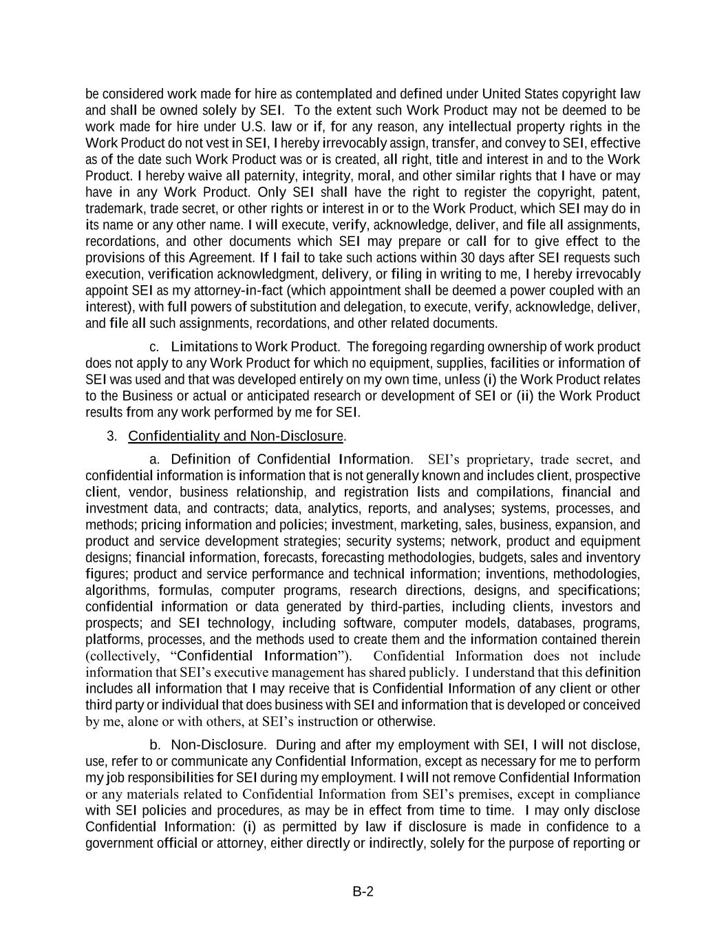 B-2 be considered work made for hire as contemplated and defined under United States copyright law and shall be owned solely by SEI. To the extent such Work Product may not be deemed to be work made for hire under U.S. law or if, for any reason, any intellectual property rights in the Work Product do not vest in SEI, I hereby irrevocably assign, transfer, and convey to SEI, effective as of the date such Work Product was or is created, all right, title and interest in and to the Work Product. I hereby waive all paternity, integrity, moral, and other similar rights that I have or may have in any Work Product. Only SEI shall have the right to register the copyright, patent, trademark, trade secret, or other rights or interest in or to the Work Product, which SEI may do in its name or any other name. I will execute, verify, acknowledge, deliver, and file all assignments, recordations, and other documents which SEI may prepare or call for to give effect to the provisions of this Agreement. If I fail to take such actions within 30 days after SEI requests such execution, verification acknowledgment, delivery, or filing in writing to me, I hereby irrevocably appoint SEI as my attorney-in-fact (which appointment shall be deemed a power coupled with an interest), with full powers of substitution and delegation, to execute, verify, acknowledge, deliver, and file all such assignments, recordations, and other related documents. c. Limitations to Work Product. The foregoing regarding ownership of work product does not apply to any Work Product for which no equipment, supplies, facilities or information of SEI was used and that was developed entirely on my own time, unless (i) the Work Product relates to the Business or actual or anticipated research or development of SEI or (ii) the Work Product results from any work performed by me for SEI. 3. Confidentiality and Non-Disclosure. a. Definition of Confidential Information. SEI’s proprietary, trade secret, and confidential information is information that is not generally known and includes client, prospective client, vendor, business relationship, and registration lists and compilations, financial and investment data, and contracts; data, analytics, reports, and analyses; systems, processes, and methods; pricing information and policies; investment, marketing, sales, business, expansion, and product and service development strategies; security systems; network, product and equipment designs; financial information, forecasts, forecasting methodologies, budgets, sales and inventory figures; product and service performance and technical information; inventions, methodologies, algorithms, formulas, computer programs, research directions, designs, and specifications; confidential information or data generated by third-parties, including clients, investors and prospects; and SEI technology, including software, computer models, databases, programs, platforms, processes, and the methods used to create them and the information contained therein (collectively, “Confidential Information”). Confidential Information does not include information that SEI’s executive management has shared publicly. I understand that this definition includes all information that I may receive that is Confidential Information of any client or other third party or individual that does business with SEI and information that is developed or conceived by me, alone or with others, at SEI’s instruction or otherwise. b. Non-Disclosure. During and after my employment with SEI, I will not disclose, use, refer to or communicate any Confidential Information, except as necessary for me to perform my job responsibilities for SEI during my employment. I will not remove Confidential Information or any materials related to Confidential Information from SEI’s premises, except in compliance with SEI policies and procedures, as may be in effect from time to time. I may only disclose Confidential Information: (i) as permitted by law if disclosure is made in confidence to a government official or attorney, either directly or indirectly, solely for the purpose of reporting or