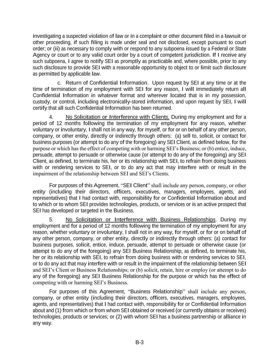 B-3 investigating a suspected violation of law or in a complaint or other document filed in a lawsuit or other proceeding, if such filing is made under seal and not disclosed, except pursuant to court order; or (ii) as necessary to comply with or respond to any subpoena issued by a Federal or State Agency or court or to any valid court order by a court of competent jurisdiction. If I receive any such subpoena, I agree to notify SEI as promptly as practicable and, where possible, prior to any such disclosure to provide SEI with a reasonable opportunity to object to or limit such disclosure as permitted by applicable law. c. Return of Confidential Information. Upon request by SEI at any time or at the time of termination of my employment with SEI for any reason, I will immediately return all Confidential Information in whatever format and wherever located that is in my possession, custody, or control, including electronically-stored information, and upon request by SEI, I will certify that all such Confidential Information has been returned. 4. No Solicitation or Interference with Clients. During my employment and for a period of 12 months following the termination of my employment for any reason, whether voluntary or involuntary, I shall not in any way, for myself, or for or on behalf of any other person, company, or other entity, directly or indirectly through others: (a) sell to, solicit, or contact for business purposes (or attempt to do any of the foregoing) any SEI Client, as defined below, for the purpose or which has the effect of competing with or harming SEI’s Business; or (b) entice, induce, persuade, attempt to persuade or otherwise cause (or attempt to do any of the foregoing) any SEI Client, as defined, to terminate his, her or its relationship with SEI, to refrain from doing business with or rendering services to SEI, or to do any act that may interfere with or result in the impairment of the relationship between SEI and SEI’s Clients. For purposes of this Agreement, “SEI Client” shall include any person, company, or other entity (including their directors, officers, executives, managers, employees, agents, and representatives) that I had contact with, responsibility for or Confidential Information about and to which or to whom SEI provides technologies, products, or services or is an active prospect that SEI has developed or targeted in the Business. 5. No Solicitation or Interference with Business Relationships. During my employment and for a period of 12 months following the termination of my employment for any reason, whether voluntary or involuntary, I shall not in any way, for myself, or for or on behalf of any other person, company, or other entity, directly or indirectly through others: (a) contact for business purposes, solicit, entice, induce, persuade, attempt to persuade or otherwise cause (or attempt to do any of the foregoing) any SEI Business Relationship, as defined, to terminate his, her or its relationship with SEI, to refrain from doing business with or rendering services to SEI, or to do any act that may interfere with or result in the impairment of the relationship between SEI and SEI’s Client or Business Relationships; or (b) solicit, retain, hire or employ (or attempt to do any of the foregoing) any SEI Business Relationship for the purpose or which has the effect of competing with or harming SEI’s Business. For purposes of this Agreement, “Business Relationship” shall include any person, company, or other entity (including their directors, officers, executives, managers, employees, agents, and representatives) that I had contact with, responsibility for or Confidential Information about and (1) from which or from whom SEI obtained or received (or currently obtains or receives) technologies, products or services; or (2) with whom SEI has a business partnership or alliance in any way.