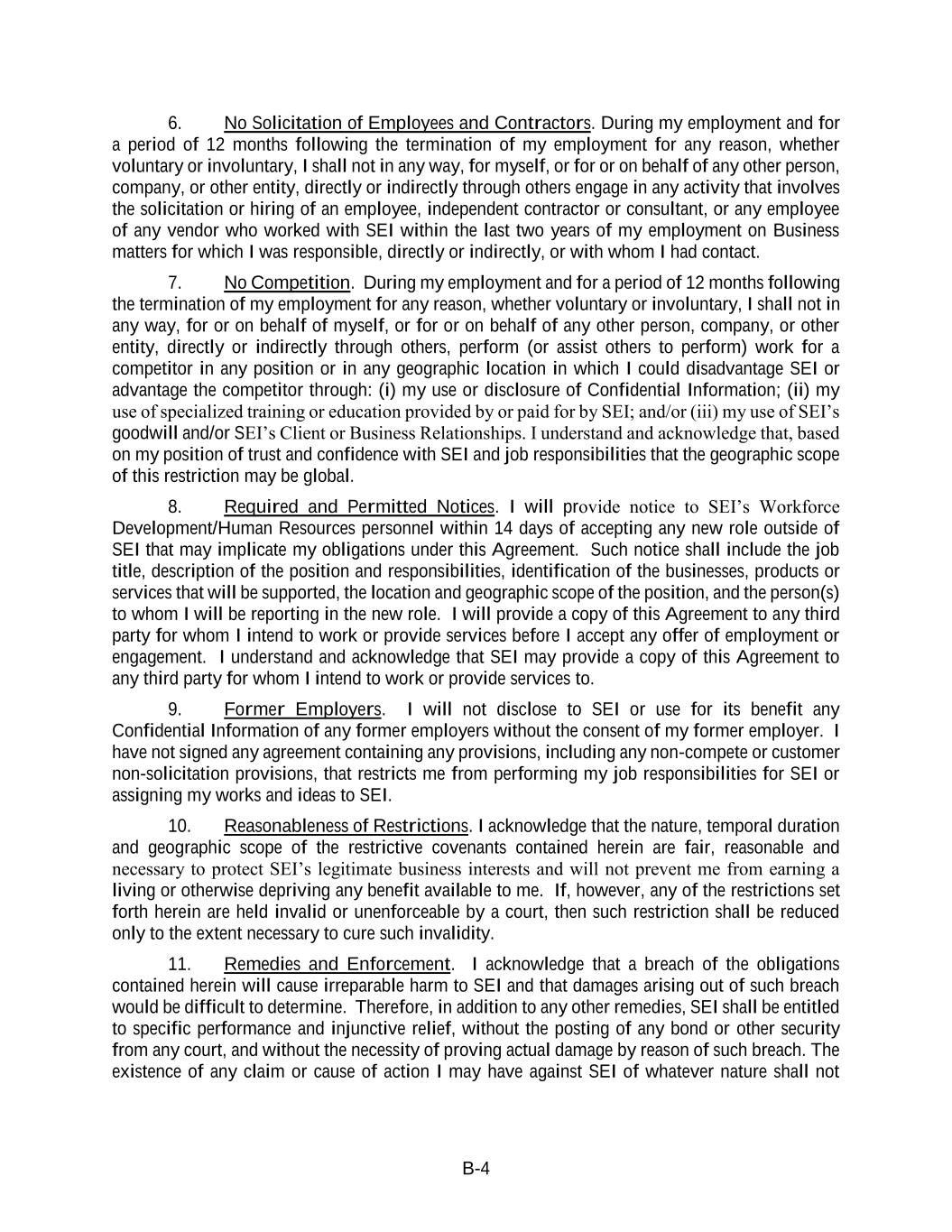 B-4 6. No Solicitation of Employees and Contractors. During my employment and for a period of 12 months following the termination of my employment for any reason, whether voluntary or involuntary, I shall not in any way, for myself, or for or on behalf of any other person, company, or other entity, directly or indirectly through others engage in any activity that involves the solicitation or hiring of an employee, independent contractor or consultant, or any employee of any vendor who worked with SEI within the last two years of my employment on Business matters for which I was responsible, directly or indirectly, or with whom I had contact. 7. No Competition. During my employment and for a period of 12 months following the termination of my employment for any reason, whether voluntary or involuntary, I shall not in any way, for or on behalf of myself, or for or on behalf of any other person, company, or other entity, directly or indirectly through others, perform (or assist others to perform) work for a competitor in any position or in any geographic location in which I could disadvantage SEI or advantage the competitor through: (i) my use or disclosure of Confidential Information; (ii) my use of specialized training or education provided by or paid for by SEI; and/or (iii) my use of SEI’s goodwill and/or SEI’s Client or Business Relationships. I understand and acknowledge that, based on my position of trust and confidence with SEI and job responsibilities that the geographic scope of this restriction may be global. 8. Required and Permitted Notices. I will provide notice to SEI’s Workforce Development/Human Resources personnel within 14 days of accepting any new role outside of SEI that may implicate my obligations under this Agreement. Such notice shall include the job title, description of the position and responsibilities, identification of the businesses, products or services that will be supported, the location and geographic scope of the position, and the person(s) to whom I will be reporting in the new role. I will provide a copy of this Agreement to any third party for whom I intend to work or provide services before I accept any offer of employment or engagement. I understand and acknowledge that SEI may provide a copy of this Agreement to any third party for whom I intend to work or provide services to. 9. Former Employers. I will not disclose to SEI or use for its benefit any Confidential Information of any former employers without the consent of my former employer. I have not signed any agreement containing any provisions, including any non-compete or customer non-solicitation provisions, that restricts me from performing my job responsibilities for SEI or assigning my works and ideas to SEI. 10. Reasonableness of Restrictions. I acknowledge that the nature, temporal duration and geographic scope of the restrictive covenants contained herein are fair, reasonable and necessary to protect SEI’s legitimate business interests and will not prevent me from earning a living or otherwise depriving any benefit available to me. If, however, any of the restrictions set forth herein are held invalid or unenforceable by a court, then such restriction shall be reduced only to the extent necessary to cure such invalidity. 11. Remedies and Enforcement. I acknowledge that a breach of the obligations contained herein will cause irreparable harm to SEI and that damages arising out of such breach would be difficult to determine. Therefore, in addition to any other remedies, SEI shall be entitled to specific performance and injunctive relief, without the posting of any bond or other security from any court, and without the necessity of proving actual damage by reason of such breach. The existence of any claim or cause of action I may have against SEI of whatever nature shall not