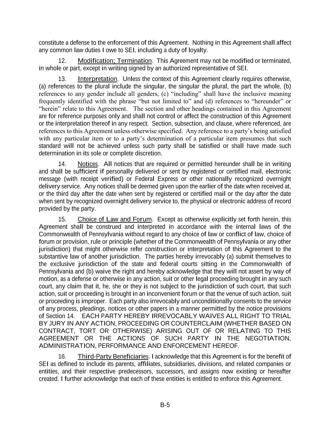 B-5 constitute a defense to the enforcement of this Agreement. Nothing in this Agreement shall affect any common law duties I owe to SEI, including a duty of loyalty. 12. Modification; Termination. This Agreement may not be modified or terminated, in whole or part, except in writing signed by an authorized representative of SEI. 13. Interpretation. Unless the context of this Agreement clearly requires otherwise, (a) references to the plural include the singular, the singular the plural, the part the whole, (b) references to any gender include all genders, (c) “including” shall have the inclusive meaning frequently identified with the phrase “but not limited to” and (d) references to “hereunder” or “herein” relate to this Agreement. The section and other headings contained in this Agreement are for reference purposes only and shall not control or affect the construction of this Agreement or the interpretation thereof in any respect. Section, subsection, and clause, where referenced, are references to this Agreement unless otherwise specified. Any reference to a party’s being satisfied with any particular item or to a party’s determination of a particular item presumes that such standard will not be achieved unless such party shall be satisfied or shall have made such determination in its sole or complete discretion. 14. Notices. All notices that are required or permitted hereunder shall be in writing and shall be sufficient if personally delivered or sent by registered or certified mail, electronic message (with receipt verified) or Federal Express or other nationally recognized overnight delivery service. Any notices shall be deemed given upon the earlier of the date when received at, or the third day after the date when sent by registered or certified mail or the day after the date when sent by recognized overnight delivery service to, the physical or electronic address of record provided by the party. 15. Choice of Law and Forum. Except as otherwise explicitly set forth herein, this Agreement shall be construed and interpreted in accordance with the internal laws of the Commonwealth of Pennsylvania without regard to any choice of law or conflict of law, choice of forum or provision, rule or principle (whether of the Commonwealth of Pennsylvania or any other jurisdiction) that might otherwise refer construction or interpretation of this Agreement to the substantive law of another jurisdiction. The parties hereby irrevocably (a) submit themselves to the exclusive jurisdiction of the state and federal courts sitting in the Commonwealth of Pennsylvania and (b) waive the right and hereby acknowledge that they will not assert by way of motion, as a defense or otherwise in any action, suit or other legal proceeding brought in any such court, any claim that it, he, she or they is not subject to the jurisdiction of such court, that such action, suit or proceeding is brought in an inconvenient forum or that the venue of such action, suit or proceeding is improper. Each party also irrevocably and unconditionally consents to the service of any process, pleadings, notices or other papers in a manner permitted by the notice provisions of Section 14. EACH PARTY HEREBY IRREVOCABLY WAIVES ALL RIGHT TO TRIAL BY JURY IN ANY ACTION, PROCEEDING OR COUNTERCLAIM (WHETHER BASED ON CONTRACT, TORT OR OTHERWISE) ARISING OUT OF OR RELATING TO THIS AGREEMENT OR THE ACTIONS OF SUCH PARTY IN THE NEGOTIATION, ADMINISTRATION, PERFORMANCE AND ENFORCEMENT HEREOF. 16. Third-Party Beneficiaries. I acknowledge that this Agreement is for the benefit of SEI as defined to include its parents, affiliates, subsidiaries, divisions, and related companies or entities, and their respective predecessors, successors, and assigns now existing or hereafter created. I further acknowledge that each of these entities is entitled to enforce this Agreement.