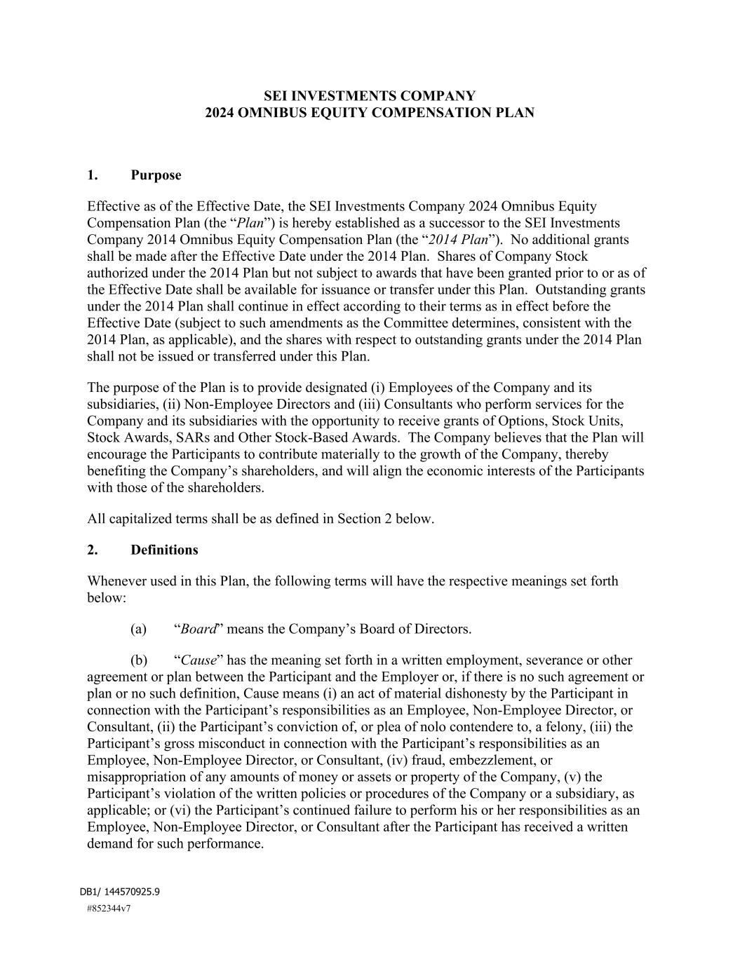 #852344v7 DB1/ 144570925.9 SEI INVESTMENTS COMPANY 2024 OMNIBUS EQUITY COMPENSATION PLAN 1. Purpose Effective as of the Effective Date, the SEI Investments Company 2024 Omnibus Equity Compensation Plan (the “Plan”) is hereby established as a successor to the SEI Investments Company 2014 Omnibus Equity Compensation Plan (the “2014 Plan”). No additional grants shall be made after the Effective Date under the 2014 Plan. Shares of Company Stock authorized under the 2014 Plan but not subject to awards that have been granted prior to or as of the Effective Date shall be available for issuance or transfer under this Plan. Outstanding grants under the 2014 Plan shall continue in effect according to their terms as in effect before the Effective Date (subject to such amendments as the Committee determines, consistent with the 2014 Plan, as applicable), and the shares with respect to outstanding grants under the 2014 Plan shall not be issued or transferred under this Plan. The purpose of the Plan is to provide designated (i) Employees of the Company and its subsidiaries, (ii) Non-Employee Directors and (iii) Consultants who perform services for the Company and its subsidiaries with the opportunity to receive grants of Options, Stock Units, Stock Awards, SARs and Other Stock-Based Awards. The Company believes that the Plan will encourage the Participants to contribute materially to the growth of the Company, thereby benefiting the Company’s shareholders, and will align the economic interests of the Participants with those of the shareholders. All capitalized terms shall be as defined in Section 2 below. 2. Definitions Whenever used in this Plan, the following terms will have the respective meanings set forth below: (a) “Board” means the Company’s Board of Directors. (b) “Cause” has the meaning set forth in a written employment, severance or other agreement or plan between the Participant and the Employer or, if there is no such agreement or plan or no such definition, Cause means (i) an act of material dishonesty by the Participant in connection with the Participant’s responsibilities as an Employee, Non-Employee Director, or Consultant, (ii) the Participant’s conviction of, or plea of nolo contendere to, a felony, (iii) the Participant’s gross misconduct in connection with the Participant’s responsibilities as an Employee, Non-Employee Director, or Consultant, (iv) fraud, embezzlement, or misappropriation of any amounts of money or assets or property of the Company, (v) the Participant’s violation of the written policies or procedures of the Company or a subsidiary, as applicable; or (vi) the Participant’s continued failure to perform his or her responsibilities as an Employee, Non-Employee Director, or Consultant after the Participant has received a written demand for such performance.