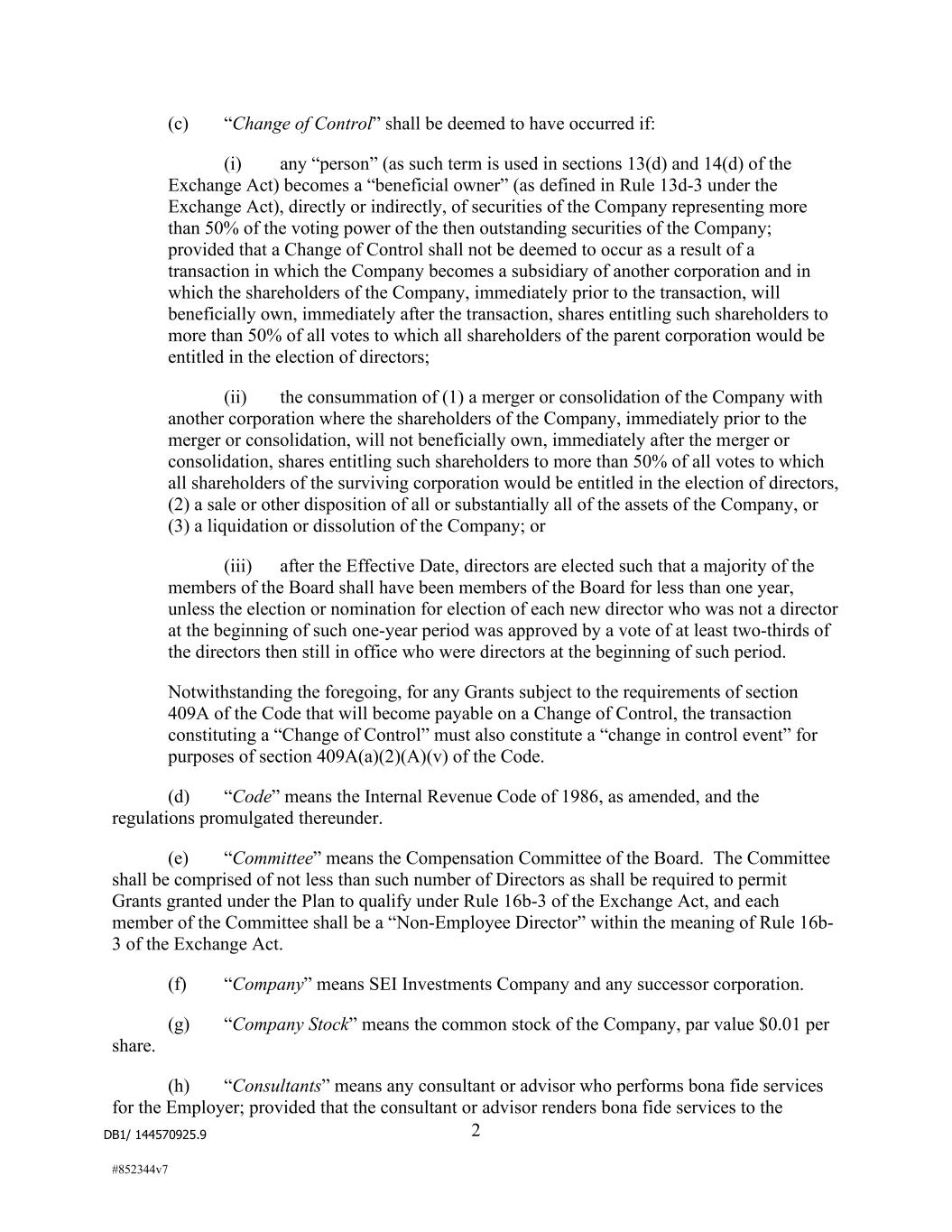 DB1/ 144570925.9 2 #852344v7 (c) “Change of Control” shall be deemed to have occurred if: (i) any “person” (as such term is used in sections 13(d) and 14(d) of the Exchange Act) becomes a “beneficial owner” (as defined in Rule 13d-3 under the Exchange Act), directly or indirectly, of securities of the Company representing more than 50% of the voting power of the then outstanding securities of the Company; provided that a Change of Control shall not be deemed to occur as a result of a transaction in which the Company becomes a subsidiary of another corporation and in which the shareholders of the Company, immediately prior to the transaction, will beneficially own, immediately after the transaction, shares entitling such shareholders to more than 50% of all votes to which all shareholders of the parent corporation would be entitled in the election of directors; (ii) the consummation of (1) a merger or consolidation of the Company with another corporation where the shareholders of the Company, immediately prior to the merger or consolidation, will not beneficially own, immediately after the merger or consolidation, shares entitling such shareholders to more than 50% of all votes to which all shareholders of the surviving corporation would be entitled in the election of directors, (2) a sale or other disposition of all or substantially all of the assets of the Company, or (3) a liquidation or dissolution of the Company; or (iii) after the Effective Date, directors are elected such that a majority of the members of the Board shall have been members of the Board for less than one year, unless the election or nomination for election of each new director who was not a director at the beginning of such one-year period was approved by a vote of at least two-thirds of the directors then still in office who were directors at the beginning of such period. Notwithstanding the foregoing, for any Grants subject to the requirements of section 409A of the Code that will become payable on a Change of Control, the transaction constituting a “Change of Control” must also constitute a “change in control event” for purposes of section 409A(a)(2)(A)(v) of the Code. (d) “Code” means the Internal Revenue Code of 1986, as amended, and the regulations promulgated thereunder. (e) “Committee” means the Compensation Committee of the Board. The Committee shall be comprised of not less than such number of Directors as shall be required to permit Grants granted under the Plan to qualify under Rule 16b-3 of the Exchange Act, and each member of the Committee shall be a “Non-Employee Director” within the meaning of Rule 16b- 3 of the Exchange Act. (f) “Company” means SEI Investments Company and any successor corporation. (g) “Company Stock” means the common stock of the Company, par value $0.01 per share. (h) “Consultants” means any consultant or advisor who performs bona fide services for the Employer; provided that the consultant or advisor renders bona fide services to the