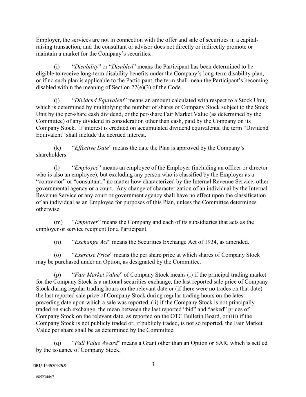 DB1/ 144570925.9 3 #852344v7 Employer, the services are not in connection with the offer and sale of securities in a capital- raising transaction, and the consultant or advisor does not directly or indirectly promote or maintain a market for the Company’s securities. (i) “Disability” or “Disabled” means the Participant has been determined to be eligible to receive long-term disability benefits under the Company’s long-term disability plan, or if no such plan is applicable to the Participant, the term shall mean the Participant’s becoming disabled within the meaning of Section 22(e)(3) of the Code. (j) “Dividend Equivalent” means an amount calculated with respect to a Stock Unit, which is determined by multiplying the number of shares of Company Stock subject to the Stock Unit by the per-share cash dividend, or the per-share Fair Market Value (as determined by the Committee) of any dividend in consideration other than cash, paid by the Company on its Company Stock. If interest is credited on accumulated dividend equivalents, the term “Dividend Equivalent” shall include the accrued interest. (k) “Effective Date” means the date the Plan is approved by the Company’s shareholders. (l) “Employee” means an employee of the Employer (including an officer or director who is also an employee), but excluding any person who is classified by the Employer as a “contractor” or “consultant,” no matter how characterized by the Internal Revenue Service, other governmental agency or a court. Any change of characterization of an individual by the Internal Revenue Service or any court or government agency shall have no effect upon the classification of an individual as an Employee for purposes of this Plan, unless the Committee determines otherwise. (m) “Employer” means the Company and each of its subsidiaries that acts as the employer or service recipient for a Participant. (n) “Exchange Act” means the Securities Exchange Act of 1934, as amended. (o) “Exercise Price” means the per share price at which shares of Company Stock may be purchased under an Option, as designated by the Committee. (p) “Fair Market Value” of Company Stock means (i) if the principal trading market for the Company Stock is a national securities exchange, the last reported sale price of Company Stock during regular trading hours on the relevant date or (if there were no trades on that date) the last reported sale price of Company Stock during regular trading hours on the latest preceding date upon which a sale was reported, (ii) if the Company Stock is not principally traded on such exchange, the mean between the last reported “bid” and “asked” prices of Company Stock on the relevant date, as reported on the OTC Bulletin Board, or (iii) if the Company Stock is not publicly traded or, if publicly traded, is not so reported, the Fair Market Value per share shall be as determined by the Committee. (q) “Full Value Award” means a Grant other than an Option or SAR, which is settled by the issuance of Company Stock.