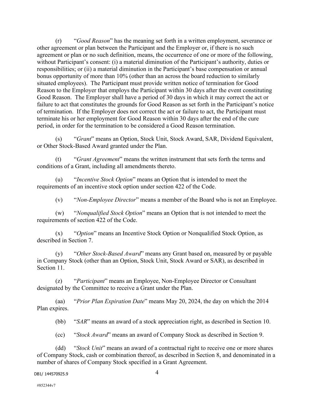 DB1/ 144570925.9 4 #852344v7 (r) “Good Reason” has the meaning set forth in a written employment, severance or other agreement or plan between the Participant and the Employer or, if there is no such agreement or plan or no such definition, means, the occurrence of one or more of the following, without Participant’s consent: (i) a material diminution of the Participant’s authority, duties or responsibilities; or (ii) a material diminution in the Participant’s base compensation or annual bonus opportunity of more than 10% (other than an across the board reduction to similarly situated employees). The Participant must provide written notice of termination for Good Reason to the Employer that employs the Participant within 30 days after the event constituting Good Reason. The Employer shall have a period of 30 days in which it may correct the act or failure to act that constitutes the grounds for Good Reason as set forth in the Participant’s notice of termination. If the Employer does not correct the act or failure to act, the Participant must terminate his or her employment for Good Reason within 30 days after the end of the cure period, in order for the termination to be considered a Good Reason termination. (s) “Grant” means an Option, Stock Unit, Stock Award, SAR, Dividend Equivalent, or Other Stock-Based Award granted under the Plan. (t) “Grant Agreement” means the written instrument that sets forth the terms and conditions of a Grant, including all amendments thereto. (u) “Incentive Stock Option” means an Option that is intended to meet the requirements of an incentive stock option under section 422 of the Code. (v) “Non-Employee Director” means a member of the Board who is not an Employee. (w) “Nonqualified Stock Option” means an Option that is not intended to meet the requirements of section 422 of the Code. (x) “Option” means an Incentive Stock Option or Nonqualified Stock Option, as described in Section 7. (y) “Other Stock-Based Award” means any Grant based on, measured by or payable in Company Stock (other than an Option, Stock Unit, Stock Award or SAR), as described in Section 11. (z) “Participant” means an Employee, Non-Employee Director or Consultant designated by the Committee to receive a Grant under the Plan. (aa) “Prior Plan Expiration Date” means May 20, 2024, the day on which the 2014 Plan expires. (bb) “SAR” means an award of a stock appreciation right, as described in Section 10. (cc) “Stock Award” means an award of Company Stock as described in Section 9. (dd) “Stock Unit” means an award of a contractual right to receive one or more shares of Company Stock, cash or combination thereof, as described in Section 8, and denominated in a number of shares of Company Stock specified in a Grant Agreement.