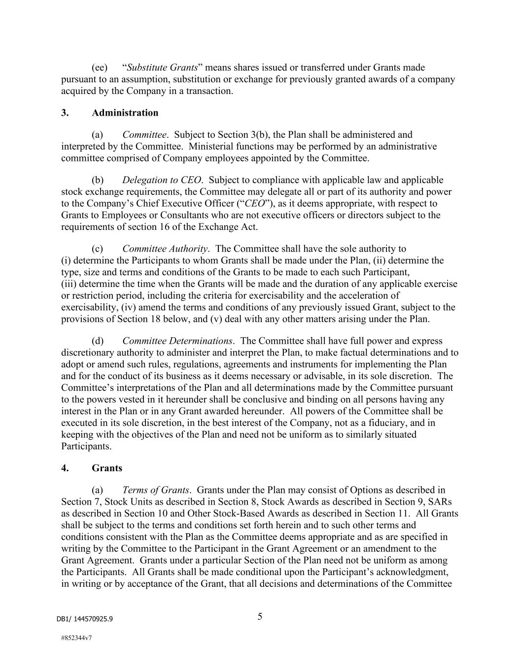 DB1/ 144570925.9 5 #852344v7 (ee) “Substitute Grants” means shares issued or transferred under Grants made pursuant to an assumption, substitution or exchange for previously granted awards of a company acquired by the Company in a transaction. 3. Administration (a) Committee. Subject to Section 3(b), the Plan shall be administered and interpreted by the Committee. Ministerial functions may be performed by an administrative committee comprised of Company employees appointed by the Committee. (b) Delegation to CEO. Subject to compliance with applicable law and applicable stock exchange requirements, the Committee may delegate all or part of its authority and power to the Company’s Chief Executive Officer (“CEO”), as it deems appropriate, with respect to Grants to Employees or Consultants who are not executive officers or directors subject to the requirements of section 16 of the Exchange Act. (c) Committee Authority. The Committee shall have the sole authority to (i) determine the Participants to whom Grants shall be made under the Plan, (ii) determine the type, size and terms and conditions of the Grants to be made to each such Participant, (iii) determine the time when the Grants will be made and the duration of any applicable exercise or restriction period, including the criteria for exercisability and the acceleration of exercisability, (iv) amend the terms and conditions of any previously issued Grant, subject to the provisions of Section 18 below, and (v) deal with any other matters arising under the Plan. (d) Committee Determinations. The Committee shall have full power and express discretionary authority to administer and interpret the Plan, to make factual determinations and to adopt or amend such rules, regulations, agreements and instruments for implementing the Plan and for the conduct of its business as it deems necessary or advisable, in its sole discretion. The Committee’s interpretations of the Plan and all determinations made by the Committee pursuant to the powers vested in it hereunder shall be conclusive and binding on all persons having any interest in the Plan or in any Grant awarded hereunder. All powers of the Committee shall be executed in its sole discretion, in the best interest of the Company, not as a fiduciary, and in keeping with the objectives of the Plan and need not be uniform as to similarly situated Participants. 4. Grants (a) Terms of Grants. Grants under the Plan may consist of Options as described in Section 7, Stock Units as described in Section 8, Stock Awards as described in Section 9, SARs as described in Section 10 and Other Stock-Based Awards as described in Section 11. All Grants shall be subject to the terms and conditions set forth herein and to such other terms and conditions consistent with the Plan as the Committee deems appropriate and as are specified in writing by the Committee to the Participant in the Grant Agreement or an amendment to the Grant Agreement. Grants under a particular Section of the Plan need not be uniform as among the Participants. All Grants shall be made conditional upon the Participant’s acknowledgment, in writing or by acceptance of the Grant, that all decisions and determinations of the Committee
