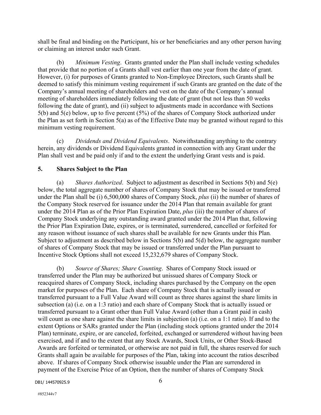 DB1/ 144570925.9 6 #852344v7 shall be final and binding on the Participant, his or her beneficiaries and any other person having or claiming an interest under such Grant. (b) Minimum Vesting. Grants granted under the Plan shall include vesting schedules that provide that no portion of a Grants shall vest earlier than one year from the date of grant. However, (i) for purposes of Grants granted to Non-Employee Directors, such Grants shall be deemed to satisfy this minimum vesting requirement if such Grants are granted on the date of the Company’s annual meeting of shareholders and vest on the date of the Company’s annual meeting of shareholders immediately following the date of grant (but not less than 50 weeks following the date of grant), and (ii) subject to adjustments made in accordance with Sections 5(b) and 5(e) below, up to five percent (5%) of the shares of Company Stock authorized under the Plan as set forth in Section 5(a) as of the Effective Date may be granted without regard to this minimum vesting requirement. (c) Dividends and Dividend Equivalents. Notwithstanding anything to the contrary herein, any dividends or Dividend Equivalents granted in connection with any Grant under the Plan shall vest and be paid only if and to the extent the underlying Grant vests and is paid. 5. Shares Subject to the Plan (a) Shares Authorized. Subject to adjustment as described in Sections 5(b) and 5(e) below, the total aggregate number of shares of Company Stock that may be issued or transferred under the Plan shall be (i) 6,500,000 shares of Company Stock, plus (ii) the number of shares of the Company Stock reserved for issuance under the 2014 Plan that remain available for grant under the 2014 Plan as of the Prior Plan Expiration Date, plus (iii) the number of shares of Company Stock underlying any outstanding award granted under the 2014 Plan that, following the Prior Plan Expiration Date, expires, or is terminated, surrendered, cancelled or forfeited for any reason without issuance of such shares shall be available for new Grants under this Plan. Subject to adjustment as described below in Sections 5(b) and 5(d) below, the aggregate number of shares of Company Stock that may be issued or transferred under the Plan pursuant to Incentive Stock Options shall not exceed 15,232,679 shares of Company Stock. (b) Source of Shares; Share Counting. Shares of Company Stock issued or transferred under the Plan may be authorized but unissued shares of Company Stock or reacquired shares of Company Stock, including shares purchased by the Company on the open market for purposes of the Plan. Each share of Company Stock that is actually issued or transferred pursuant to a Full Value Award will count as three shares against the share limits in subsection (a) (i.e. on a 1:3 ratio) and each share of Company Stock that is actually issued or transferred pursuant to a Grant other than Full Value Award (other than a Grant paid in cash) will count as one share against the share limits in subjection (a) (i.e. on a 1:1 ratio). If and to the extent Options or SARs granted under the Plan (including stock options granted under the 2014 Plan) terminate, expire, or are canceled, forfeited, exchanged or surrendered without having been exercised, and if and to the extent that any Stock Awards, Stock Units, or Other Stock-Based Awards are forfeited or terminated, or otherwise are not paid in full, the shares reserved for such Grants shall again be available for purposes of the Plan, taking into account the ratios described above. If shares of Company Stock otherwise issuable under the Plan are surrendered in payment of the Exercise Price of an Option, then the number of shares of Company Stock