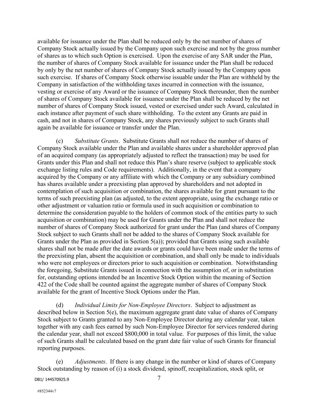 DB1/ 144570925.9 7 #852344v7 available for issuance under the Plan shall be reduced only by the net number of shares of Company Stock actually issued by the Company upon such exercise and not by the gross number of shares as to which such Option is exercised. Upon the exercise of any SAR under the Plan, the number of shares of Company Stock available for issuance under the Plan shall be reduced by only by the net number of shares of Company Stock actually issued by the Company upon such exercise. If shares of Company Stock otherwise issuable under the Plan are withheld by the Company in satisfaction of the withholding taxes incurred in connection with the issuance, vesting or exercise of any Award or the issuance of Company Stock thereunder, then the number of shares of Company Stock available for issuance under the Plan shall be reduced by the net number of shares of Company Stock issued, vested or exercised under such Award, calculated in each instance after payment of such share withholding. To the extent any Grants are paid in cash, and not in shares of Company Stock, any shares previously subject to such Grants shall again be available for issuance or transfer under the Plan. (c) Substitute Grants. Substitute Grants shall not reduce the number of shares of Company Stock available under the Plan and available shares under a shareholder approved plan of an acquired company (as appropriately adjusted to reflect the transaction) may be used for Grants under this Plan and shall not reduce this Plan’s share reserve (subject to applicable stock exchange listing rules and Code requirements). Additionally, in the event that a company acquired by the Company or any affiliate with which the Company or any subsidiary combined has shares available under a preexisting plan approved by shareholders and not adopted in contemplation of such acquisition or combination, the shares available for grant pursuant to the terms of such preexisting plan (as adjusted, to the extent appropriate, using the exchange ratio or other adjustment or valuation ratio or formula used in such acquisition or combination to determine the consideration payable to the holders of common stock of the entities party to such acquisition or combination) may be used for Grants under the Plan and shall not reduce the number of shares of Company Stock authorized for grant under the Plan (and shares of Company Stock subject to such Grants shall not be added to the shares of Company Stock available for Grants under the Plan as provided in Section 5(a)); provided that Grants using such available shares shall not be made after the date awards or grants could have been made under the terms of the preexisting plan, absent the acquisition or combination, and shall only be made to individuals who were not employees or directors prior to such acquisition or combination. Notwithstanding the foregoing, Substitute Grants issued in connection with the assumption of, or in substitution for, outstanding options intended be an Incentive Stock Option within the meaning of Section 422 of the Code shall be counted against the aggregate number of shares of Company Stock available for the grant of Incentive Stock Options under the Plan. (d) Individual Limits for Non-Employee Directors. Subject to adjustment as described below in Section 5(e), the maximum aggregate grant date value of shares of Company Stock subject to Grants granted to any Non-Employee Director during any calendar year, taken together with any cash fees earned by such Non-Employee Director for services rendered during the calendar year, shall not exceed $800,000 in total value. For purposes of this limit, the value of such Grants shall be calculated based on the grant date fair value of such Grants for financial reporting purposes. (e) Adjustments. If there is any change in the number or kind of shares of Company Stock outstanding by reason of (i) a stock dividend, spinoff, recapitalization, stock split, or