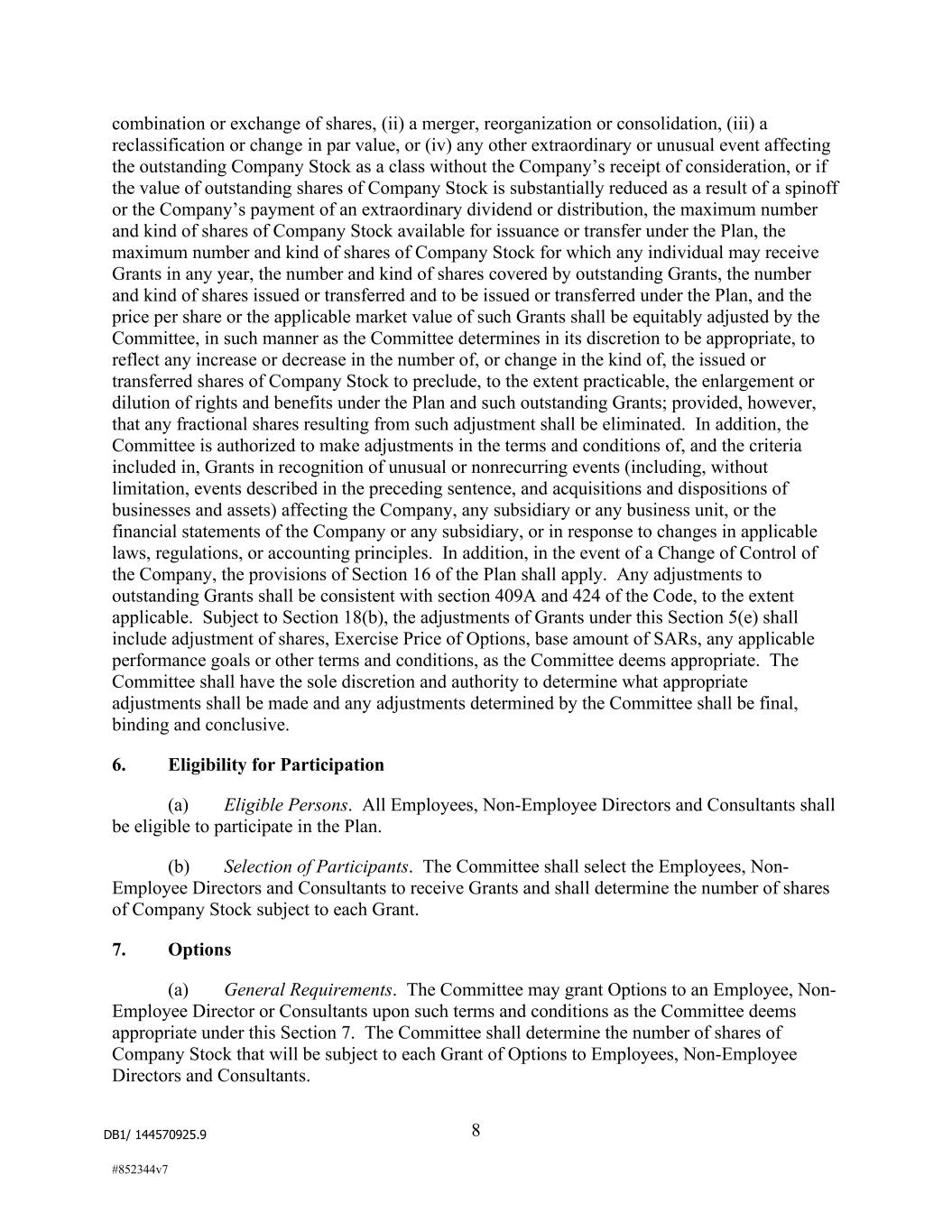 DB1/ 144570925.9 8 #852344v7 combination or exchange of shares, (ii) a merger, reorganization or consolidation, (iii) a reclassification or change in par value, or (iv) any other extraordinary or unusual event affecting the outstanding Company Stock as a class without the Company’s receipt of consideration, or if the value of outstanding shares of Company Stock is substantially reduced as a result of a spinoff or the Company’s payment of an extraordinary dividend or distribution, the maximum number and kind of shares of Company Stock available for issuance or transfer under the Plan, the maximum number and kind of shares of Company Stock for which any individual may receive Grants in any year, the number and kind of shares covered by outstanding Grants, the number and kind of shares issued or transferred and to be issued or transferred under the Plan, and the price per share or the applicable market value of such Grants shall be equitably adjusted by the Committee, in such manner as the Committee determines in its discretion to be appropriate, to reflect any increase or decrease in the number of, or change in the kind of, the issued or transferred shares of Company Stock to preclude, to the extent practicable, the enlargement or dilution of rights and benefits under the Plan and such outstanding Grants; provided, however, that any fractional shares resulting from such adjustment shall be eliminated. In addition, the Committee is authorized to make adjustments in the terms and conditions of, and the criteria included in, Grants in recognition of unusual or nonrecurring events (including, without limitation, events described in the preceding sentence, and acquisitions and dispositions of businesses and assets) affecting the Company, any subsidiary or any business unit, or the financial statements of the Company or any subsidiary, or in response to changes in applicable laws, regulations, or accounting principles. In addition, in the event of a Change of Control of the Company, the provisions of Section 16 of the Plan shall apply. Any adjustments to outstanding Grants shall be consistent with section 409A and 424 of the Code, to the extent applicable. Subject to Section 18(b), the adjustments of Grants under this Section 5(e) shall include adjustment of shares, Exercise Price of Options, base amount of SARs, any applicable performance goals or other terms and conditions, as the Committee deems appropriate. The Committee shall have the sole discretion and authority to determine what appropriate adjustments shall be made and any adjustments determined by the Committee shall be final, binding and conclusive. 6. Eligibility for Participation (a) Eligible Persons. All Employees, Non-Employee Directors and Consultants shall be eligible to participate in the Plan. (b) Selection of Participants. The Committee shall select the Employees, Non- Employee Directors and Consultants to receive Grants and shall determine the number of shares of Company Stock subject to each Grant. 7. Options (a) General Requirements. The Committee may grant Options to an Employee, Non- Employee Director or Consultants upon such terms and conditions as the Committee deems appropriate under this Section 7. The Committee shall determine the number of shares of Company Stock that will be subject to each Grant of Options to Employees, Non-Employee Directors and Consultants.